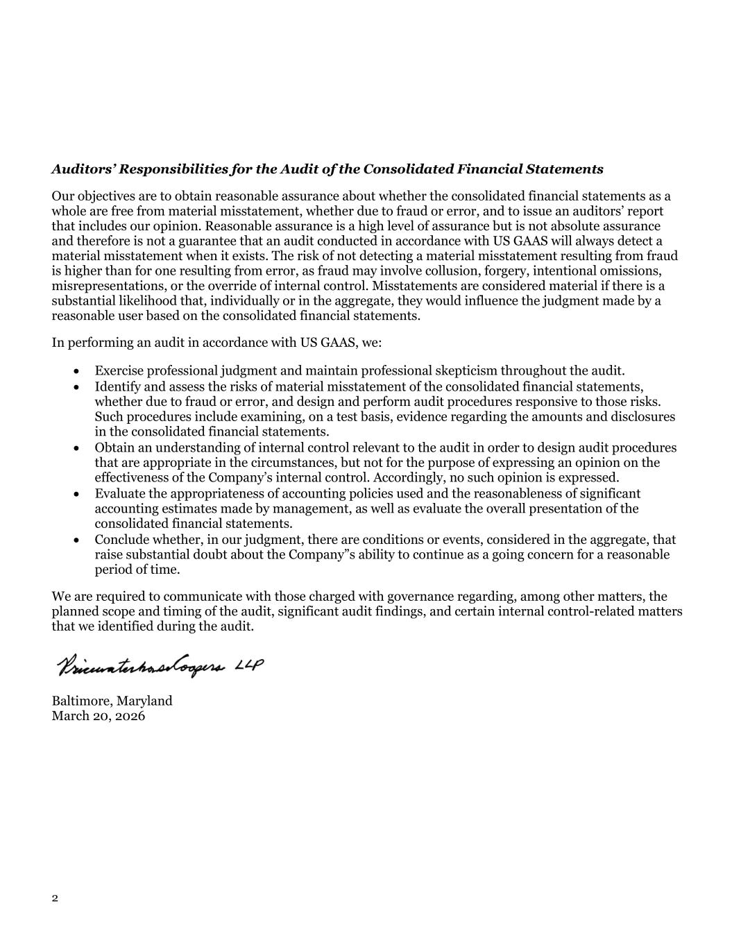 2 Auditors’ Responsibilities for the Audit of the Consolidated Financial Statements Our objectives are to obtain reasonable assurance about whether the consolidated financial statements as a whole are free from material misstatement, whether due to fraud or error, and to issue an auditors’ report that includes our opinion. Reasonable assurance is a high level of assurance but is not absolute assurance and therefore is not a guarantee that an audit conducted in accordance with US GAAS will always detect a material misstatement when it exists. The risk of not detecting a material misstatement resulting from fraud is higher than for one resulting from error, as fraud may involve collusion, forgery, intentional omissions, misrepresentations, or the override of internal control. Misstatements are considered material if there is a substantial likelihood that, individually or in the aggregate, they would influence the judgment made by a reasonable user based on the consolidated financial statements. In performing an audit in accordance with US GAAS, we: • Exercise professional judgment and maintain professional skepticism throughout the audit. • Identify and assess the risks of material misstatement of the consolidated financial statements, whether due to fraud or error, and design and perform audit procedures responsive to those risks. Such procedures include examining, on a test basis, evidence regarding the amounts and disclosures in the consolidated financial statements. • Obtain an understanding of internal control relevant to the audit in order to design audit procedures that are appropriate in the circumstances, but not for the purpose of expressing an opinion on the effectiveness of the Company’s internal control. Accordingly, no such opinion is expressed. • Evaluate the appropriateness of accounting policies used and the reasonableness of significant accounting estimates made by management, as well as evaluate the overall presentation of the consolidated financial statements. • Conclude whether, in our judgment, there are conditions or events, considered in the aggregate, that raise substantial doubt about the Company”s ability to continue as a going concern for a reasonable period of time. We are required to communicate with those charged with governance regarding, among other matters, the planned scope and timing of the audit, significant audit findings, and certain internal control-related matters that we identified during the audit. Baltimore, Maryland March 20, 2026
