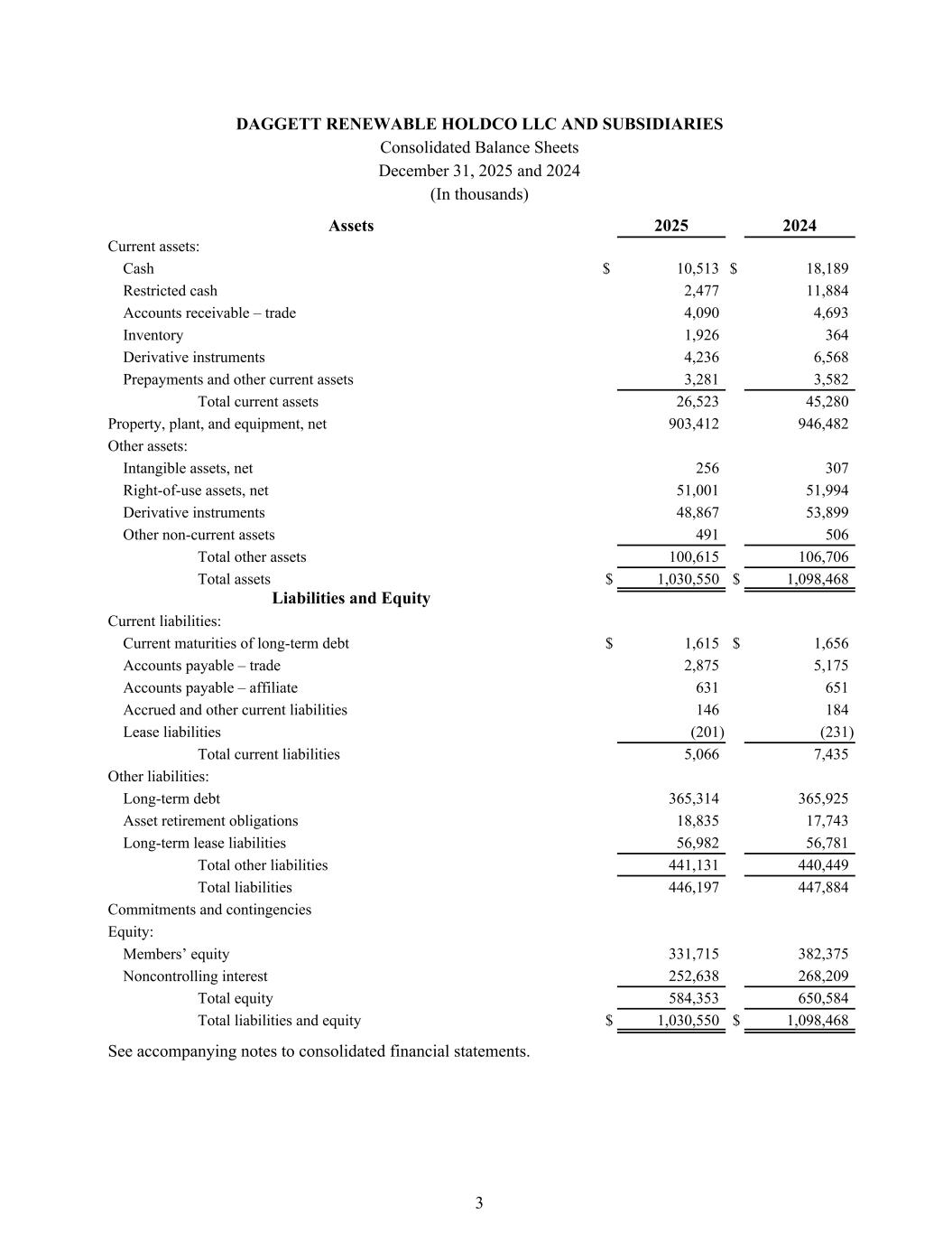 DAGGETT RENEWABLE HOLDCO LLC AND SUBSIDIARIES Consolidated Balance Sheets December 31, 2025 and 2024 (In thousands) Assets 2025 2024 Current assets: Cash $ 10,513 $ 18,189 Restricted cash 2,477 11,884 Accounts receivable – trade 4,090 4,693 Inventory 1,926 364 Derivative instruments 4,236 6,568 Prepayments and other current assets 3,281 3,582 Total current assets 26,523 45,280 Property, plant, and equipment, net 903,412 946,482 Other assets: Intangible assets, net 256 307 Right-of-use assets, net 51,001 51,994 Derivative instruments 48,867 53,899 Other non-current assets 491 506 Total other assets 100,615 106,706 Total assets $ 1,030,550 $ 1,098,468 Liabilities and Equity Current liabilities: Current maturities of long-term debt $ 1,615 $ 1,656 Accounts payable – trade 2,875 5,175 Accounts payable – affiliate 631 651 Accrued and other current liabilities 146 184 Lease liabilities (201) (231) Total current liabilities 5,066 7,435 Other liabilities: Long-term debt 365,314 365,925 Asset retirement obligations 18,835 17,743 Long-term lease liabilities 56,982 56,781 Total other liabilities 441,131 440,449 Total liabilities 446,197 447,884 Commitments and contingencies Equity: Members’ equity 331,715 382,375 Noncontrolling interest 252,638 268,209 Total equity 584,353 650,584 Total liabilities and equity $ 1,030,550 $ 1,098,468 See accompanying notes to consolidated financial statements. 3