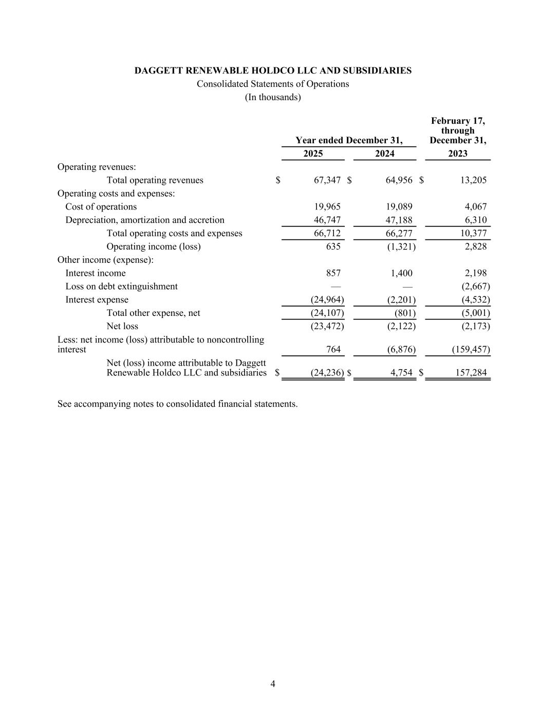 DAGGETT RENEWABLE HOLDCO LLC AND SUBSIDIARIES Consolidated Statements of Operations (In thousands) Year ended December 31, February 17, through December 31, 2025 2024 2023 Operating revenues: Total operating revenues $ 67,347 $ 64,956 $ 13,205 Operating costs and expenses: Cost of operations 19,965 19,089 4,067 Depreciation, amortization and accretion 46,747 47,188 6,310 Total operating costs and expenses 66,712 66,277 10,377 Operating income (loss) 635 (1,321) 2,828 Other income (expense): Interest income 857 1,400 2,198 Loss on debt extinguishment — — (2,667) Interest expense (24,964) (2,201) (4,532) Total other expense, net (24,107) (801) (5,001) Net loss (23,472) (2,122) (2,173) Less: net income (loss) attributable to noncontrolling interest 764 (6,876) (159,457) Net (loss) income attributable to Daggett Renewable Holdco LLC and subsidiaries $ (24,236) $ 4,754 $ 157,284 See accompanying notes to consolidated financial statements. 4
