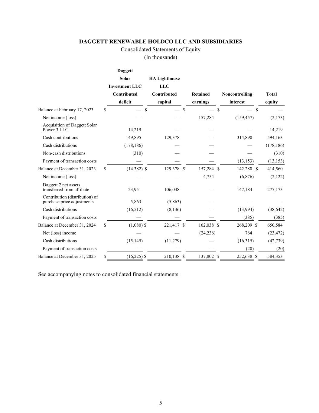 DAGGETT RENEWABLE HOLDCO LLC AND SUBSIDIARIES Consolidated Statements of Equity (In thousands) Daggett Solar HA Lighthouse Investment LLC LLC Contributed Contributed Retained Noncontrolling Total deficit capital earnings interest equity Balance at February 17, 2023 $ — $ — $ — $ — $ — Net income (loss) — — 157,284 (159,457) (2,173) Acquisition of Daggett Solar Power 3 LLC 14,219 — — — 14,219 Cash contributions 149,895 129,378 — 314,890 594,163 Cash distributions (178,186) — — — (178,186) Non-cash distributions (310) — — — (310) Payment of transaction costs — — — (13,153) (13,153) Balance at December 31, 2023 $ (14,382) $ 129,378 $ 157,284 $ 142,280 $ 414,560 Net income (loss) — — 4,754 (6,876) (2,122) Daggett 2 net assets transferred from affiliate 23,951 106,038 — 147,184 277,173 Contribution (distribution) of purchase price adjustments 5,863 (5,863) — — — Cash distributions (16,512) (8,136) — (13,994) (38,642) Payment of transaction costs — — — (385) (385) Balance at December 31, 2024 $ (1,080) $ 221,417 $ 162,038 $ 268,209 $ 650,584 Net (loss) income — — (24,236) 764 (23,472) Cash distributions (15,145) (11,279) — (16,315) (42,739) Payment of transaction costs — — — (20) (20) Balance at December 31, 2025 $ (16,225) $ 210,138 $ 137,802 $ 252,638 $ 584,353 See accompanying notes to consolidated financial statements. 5