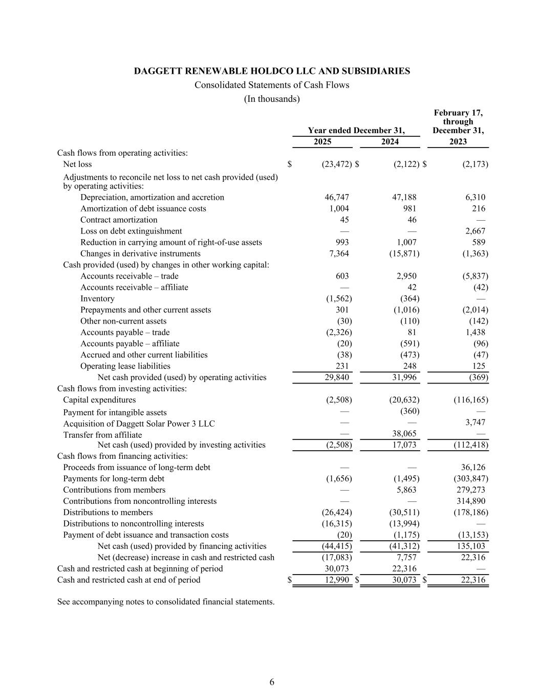 DAGGETT RENEWABLE HOLDCO LLC AND SUBSIDIARIES Consolidated Statements of Cash Flows (In thousands) Year ended December 31, February 17, through December 31, 2025 2024 2023 Cash flows from operating activities: Net loss $ (23,472) $ (2,122) $ (2,173) Adjustments to reconcile net loss to net cash provided (used) by operating activities: Depreciation, amortization and accretion 46,747 47,188 6,310 Amortization of debt issuance costs 1,004 981 216 Contract amortization 45 46 — Loss on debt extinguishment — — 2,667 Reduction in carrying amount of right-of-use assets 993 1,007 589 Changes in derivative instruments 7,364 (15,871) (1,363) Cash provided (used) by changes in other working capital: Accounts receivable – trade 603 2,950 (5,837) Accounts receivable – affiliate — 42 (42) Inventory (1,562) (364) — Prepayments and other current assets 301 (1,016) (2,014) Other non-current assets (30) (110) (142) Accounts payable – trade (2,326) 81 1,438 Accounts payable – affiliate (20) (591) (96) Accrued and other current liabilities (38) (473) (47) Operating lease liabilities 231 248 125 Net cash provided (used) by operating activities 29,840 31,996 (369) Cash flows from investing activities: Capital expenditures (2,508) (20,632) (116,165) Payment for intangible assets — (360) — Acquisition of Daggett Solar Power 3 LLC — — 3,747 Transfer from affiliate — 38,065 — Net cash (used) provided by investing activities (2,508) 17,073 (112,418) Cash flows from financing activities: Proceeds from issuance of long-term debt — — 36,126 Payments for long-term debt (1,656) (1,495) (303,847) Contributions from members — 5,863 279,273 Contributions from noncontrolling interests — — 314,890 Distributions to members (26,424) (30,511) (178,186) Distributions to noncontrolling interests (16,315) (13,994) — Payment of debt issuance and transaction costs (20) (1,175) (13,153) Net cash (used) provided by financing activities (44,415) (41,312) 135,103 Net (decrease) increase in cash and restricted cash (17,083) 7,757 22,316 Cash and restricted cash at beginning of period 30,073 22,316 — Cash and restricted cash at end of period $ 12,990 $ 30,073 $ 22,316 See accompanying notes to consolidated financial statements. 6