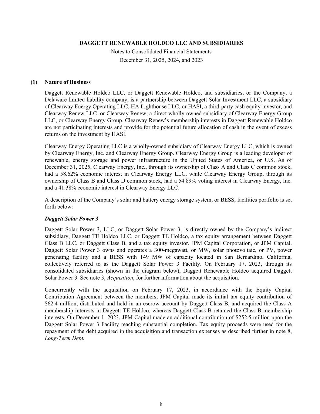 (1) Nature of Business Daggett Renewable Holdco LLC, or Daggett Renewable Holdco, and subsidiaries, or the Company, a Delaware limited liability company, is a partnership between Daggett Solar Investment LLC, a subsidiary of Clearway Energy Operating LLC, HA Lighthouse LLC, or HASI, a third-party cash equity investor, and Clearway Renew LLC, or Clearway Renew, a direct wholly-owned subsidiary of Clearway Energy Group LLC, or Clearway Energy Group. Clearway Renew’s membership interests in Daggett Renewable Holdco are not participating interests and provide for the potential future allocation of cash in the event of excess returns on the investment by HASI. Clearway Energy Operating LLC is a wholly-owned subsidiary of Clearway Energy LLC, which is owned by Clearway Energy, Inc. and Clearway Energy Group. Clearway Energy Group is a leading developer of renewable, energy storage and power infrastructure in the United States of America, or U.S. As of December 31, 2025, Clearway Energy, Inc., through its ownership of Class A and Class C common stock, had a 58.62% economic interest in Clearway Energy LLC, while Clearway Energy Group, through its ownership of Class B and Class D common stock, had a 54.89% voting interest in Clearway Energy, Inc. and a 41.38% economic interest in Clearway Energy LLC. A description of the Company’s solar and battery energy storage system, or BESS, facilities portfolio is set forth below: Daggett Solar Power 3 Daggett Solar Power 3, LLC, or Daggett Solar Power 3, is directly owned by the Company’s indirect subsidiary, Daggett TE Holdco LLC, or Daggett TE Holdco, a tax equity arrangement between Daggett Class B LLC, or Daggett Class B, and a tax equity investor, JPM Capital Corporation, or JPM Capital. Daggett Solar Power 3 owns and operates a 300-megawatt, or MW, solar photovoltaic, or PV, power generating facility and a BESS with 149 MW of capacity located in San Bernardino, California, collectively referred to as the Daggett Solar Power 3 Facility. On February 17, 2023, through its consolidated subsidiaries (shown in the diagram below), Daggett Renewable Holdco acquired Daggett Solar Power 3. See note 3, Acquisition, for further information about the acquisition. Concurrently with the acquisition on February 17, 2023, in accordance with the Equity Capital Contribution Agreement between the members, JPM Capital made its initial tax equity contribution of $62.4 million, distributed and held in an escrow account by Daggett Class B, and acquired the Class A membership interests in Daggett TE Holdco, whereas Daggett Class B retained the Class B membership interests. On December 1, 2023, JPM Capital made an additional contribution of $252.5 million upon the Daggett Solar Power 3 Facility reaching substantial completion. Tax equity proceeds were used for the repayment of the debt acquired in the acquisition and transaction expenses as described further in note 8, Long-Term Debt. DAGGETT RENEWABLE HOLDCO LLC AND SUBSIDIARIES Notes to Consolidated Financial Statements December 31, 2025, 2024, and 2023 8