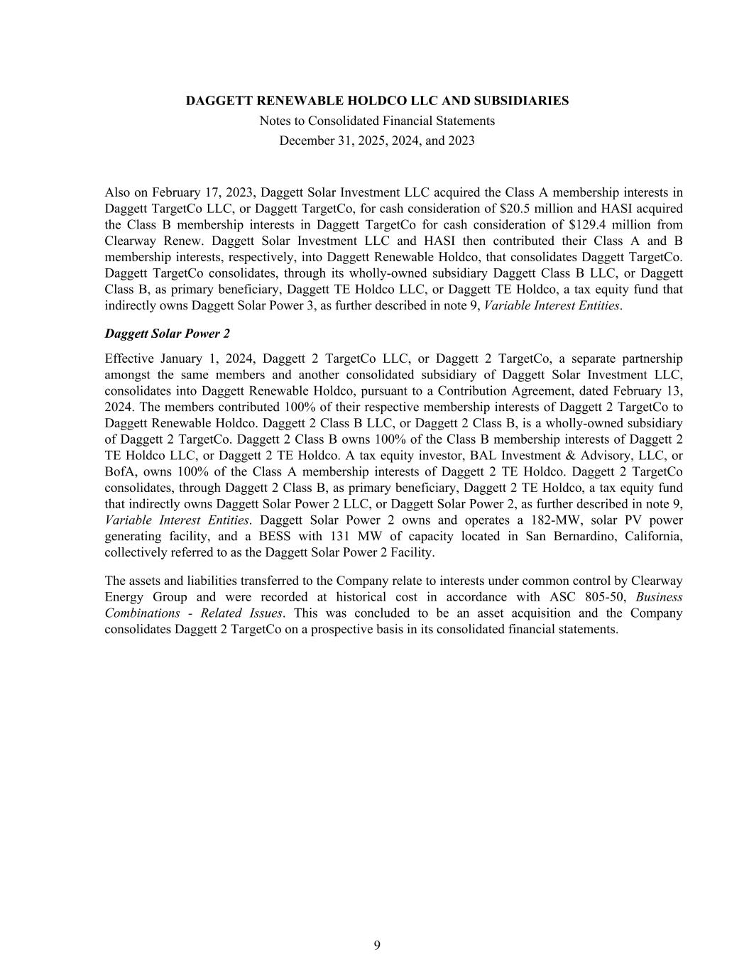 Also on February 17, 2023, Daggett Solar Investment LLC acquired the Class A membership interests in Daggett TargetCo LLC, or Daggett TargetCo, for cash consideration of $20.5 million and HASI acquired the Class B membership interests in Daggett TargetCo for cash consideration of $129.4 million from Clearway Renew. Daggett Solar Investment LLC and HASI then contributed their Class A and B membership interests, respectively, into Daggett Renewable Holdco, that consolidates Daggett TargetCo. Daggett TargetCo consolidates, through its wholly-owned subsidiary Daggett Class B LLC, or Daggett Class B, as primary beneficiary, Daggett TE Holdco LLC, or Daggett TE Holdco, a tax equity fund that indirectly owns Daggett Solar Power 3, as further described in note 9, Variable Interest Entities. Daggett Solar Power 2 Effective January 1, 2024, Daggett 2 TargetCo LLC, or Daggett 2 TargetCo, a separate partnership amongst the same members and another consolidated subsidiary of Daggett Solar Investment LLC, consolidates into Daggett Renewable Holdco, pursuant to a Contribution Agreement, dated February 13, 2024. The members contributed 100% of their respective membership interests of Daggett 2 TargetCo to Daggett Renewable Holdco. Daggett 2 Class B LLC, or Daggett 2 Class B, is a wholly-owned subsidiary of Daggett 2 TargetCo. Daggett 2 Class B owns 100% of the Class B membership interests of Daggett 2 TE Holdco LLC, or Daggett 2 TE Holdco. A tax equity investor, BAL Investment & Advisory, LLC, or BofA, owns 100% of the Class A membership interests of Daggett 2 TE Holdco. Daggett 2 TargetCo consolidates, through Daggett 2 Class B, as primary beneficiary, Daggett 2 TE Holdco, a tax equity fund that indirectly owns Daggett Solar Power 2 LLC, or Daggett Solar Power 2, as further described in note 9, Variable Interest Entities. Daggett Solar Power 2 owns and operates a 182-MW, solar PV power generating facility, and a BESS with 131 MW of capacity located in San Bernardino, California, collectively referred to as the Daggett Solar Power 2 Facility. The assets and liabilities transferred to the Company relate to interests under common control by Clearway Energy Group and were recorded at historical cost in accordance with ASC 805-50, Business Combinations - Related Issues. This was concluded to be an asset acquisition and the Company consolidates Daggett 2 TargetCo on a prospective basis in its consolidated financial statements. DAGGETT RENEWABLE HOLDCO LLC AND SUBSIDIARIES Notes to Consolidated Financial Statements December 31, 2025, 2024, and 2023 9