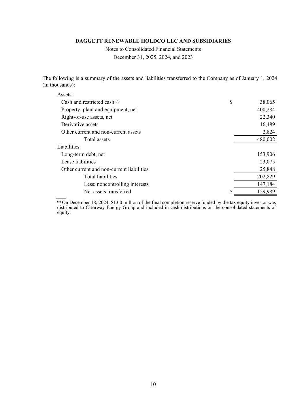 The following is a summary of the assets and liabilities transferred to the Company as of January 1, 2024 (in thousands): Assets: Cash and restricted cash (a) $ 38,065 Property, plant and equipment, net 400,284 Right-of-use assets, net 22,340 Derivative assets 16,489 Other current and non-current assets 2,824 Total assets 480,002 Liabilities: Long-term debt, net 153,906 Lease liabilities 23,075 Other current and non-current liabilities 25,848 Total liabilities 202,829 Less: noncontrolling interests 147,184 Net assets transferred $ 129,989 (a) On December 18, 2024, $13.0 million of the final completion reserve funded by the tax equity investor was distributed to Clearway Energy Group and included in cash distributions on the consolidated statements of equity. DAGGETT RENEWABLE HOLDCO LLC AND SUBSIDIARIES Notes to Consolidated Financial Statements December 31, 2025, 2024, and 2023 10