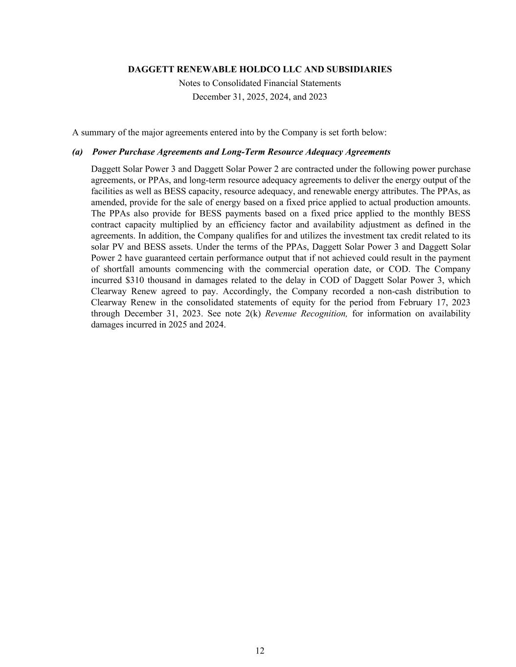 A summary of the major agreements entered into by the Company is set forth below: (a) Power Purchase Agreements and Long-Term Resource Adequacy Agreements Daggett Solar Power 3 and Daggett Solar Power 2 are contracted under the following power purchase agreements, or PPAs, and long-term resource adequacy agreements to deliver the energy output of the facilities as well as BESS capacity, resource adequacy, and renewable energy attributes. The PPAs, as amended, provide for the sale of energy based on a fixed price applied to actual production amounts. The PPAs also provide for BESS payments based on a fixed price applied to the monthly BESS contract capacity multiplied by an efficiency factor and availability adjustment as defined in the agreements. In addition, the Company qualifies for and utilizes the investment tax credit related to its solar PV and BESS assets. Under the terms of the PPAs, Daggett Solar Power 3 and Daggett Solar Power 2 have guaranteed certain performance output that if not achieved could result in the payment of shortfall amounts commencing with the commercial operation date, or COD. The Company incurred $310 thousand in damages related to the delay in COD of Daggett Solar Power 3, which Clearway Renew agreed to pay. Accordingly, the Company recorded a non-cash distribution to Clearway Renew in the consolidated statements of equity for the period from February 17, 2023 through December 31, 2023. See note 2(k) Revenue Recognition, for information on availability damages incurred in 2025 and 2024. DAGGETT RENEWABLE HOLDCO LLC AND SUBSIDIARIES Notes to Consolidated Financial Statements December 31, 2025, 2024, and 2023 12