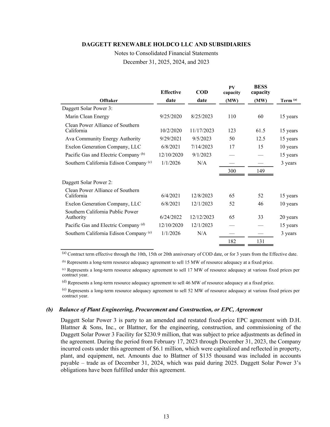 Effective COD PV capacity BESS capacity Offtaker date date (MW) (MW) Term (a) Daggett Solar Power 3: Marin Clean Energy 9/25/2020 8/25/2023 110 60 15 years Clean Power Alliance of Southern California 10/2/2020 11/17/2023 123 61.5 15 years Ava Community Energy Authority 9/29/2021 9/5/2023 50 12.5 15 years Exelon Generation Company, LLC 6/8/2021 7/14/2023 17 15 10 years Pacific Gas and Electric Company (b) 12/10/2020 9/1/2023 — — 15 years Southern California Edison Company (c) 1/1/2026 N/A — — 3 years 300 149 Daggett Solar Power 2: Clean Power Alliance of Southern California 6/4/2021 12/8/2023 65 52 15 years Exelon Generation Company, LLC 6/8/2021 12/1/2023 52 46 10 years Southern California Public Power Authority 6/24/2022 12/12/2023 65 33 20 years Pacific Gas and Electric Company (d) 12/10/2020 12/1/2023 — — 15 years Southern California Edison Company (e) 1/1/2026 N/A — — 3 years 182 131 (a) Contract term effective through the 10th, 15th or 20th anniversary of COD date, or for 3 years from the Effective date. (b) Represents a long-term resource adequacy agreement to sell 15 MW of resource adequacy at a fixed price. (c) Represents a long-term resource adequacy agreement to sell 17 MW of resource adequacy at various fixed prices per contract year. (d) Represents a long-term resource adequacy agreement to sell 46 MW of resource adequacy at a fixed price. (e) Represents a long-term resource adequacy agreement to sell 52 MW of resource adequacy at various fixed prices per contract year. (b) Balance of Plant Engineering, Procurement and Construction, or EPC, Agreement Daggett Solar Power 3 is party to an amended and restated fixed-price EPC agreement with D.H. Blattner & Sons, Inc., or Blattner, for the engineering, construction, and commissioning of the Daggett Solar Power 3 Facility for $230.9 million, that was subject to price adjustments as defined in the agreement. During the period from February 17, 2023 through December 31, 2023, the Company incurred costs under this agreement of $6.1 million, which were capitalized and reflected in property, plant, and equipment, net. Amounts due to Blattner of $135 thousand was included in accounts payable – trade as of December 31, 2024, which was paid during 2025. Daggett Solar Power 3’s obligations have been fulfilled under this agreement. DAGGETT RENEWABLE HOLDCO LLC AND SUBSIDIARIES Notes to Consolidated Financial Statements December 31, 2025, 2024, and 2023 13