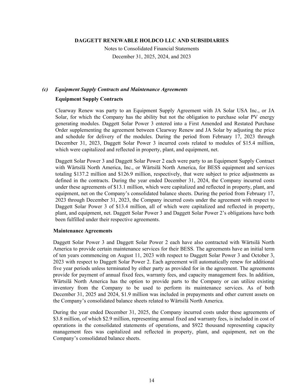 (c) Equipment Supply Contracts and Maintenance Agreements Equipment Supply Contracts Clearway Renew was party to an Equipment Supply Agreement with JA Solar USA Inc., or JA Solar, for which the Company has the ability but not the obligation to purchase solar PV energy generating modules. Daggett Solar Power 3 entered into a First Amended and Restated Purchase Order supplementing the agreement between Clearway Renew and JA Solar by adjusting the price and schedule for delivery of the modules. During the period from February 17, 2023 through December 31, 2023, Daggett Solar Power 3 incurred costs related to modules of $15.4 million, which were capitalized and reflected in property, plant, and equipment, net. Daggett Solar Power 3 and Daggett Solar Power 2 each were party to an Equipment Supply Contract with Wärtsilä North America, Inc., or Wärtsilä North America, for BESS equipment and services totaling $137.2 million and $126.9 million, respectively, that were subject to price adjustments as defined in the contracts. During the year ended December 31, 2024, the Company incurred costs under these agreements of $13.1 million, which were capitalized and reflected in property, plant, and equipment, net on the Company’s consolidated balance sheets. During the period from February 17, 2023 through December 31, 2023, the Company incurred costs under the agreement with respect to Daggett Solar Power 3 of $13.4 million, all of which were capitalized and reflected in property, plant, and equipment, net. Daggett Solar Power 3 and Daggett Solar Power 2’s obligations have both been fulfilled under their respective agreements. Maintenance Agreements Daggett Solar Power 3 and Daggett Solar Power 2 each have also contracted with Wärtsilä North America to provide certain maintenance services for their BESS. The agreements have an initial term of ten years commencing on August 11, 2023 with respect to Daggett Solar Power 3 and October 3, 2023 with respect to Daggett Solar Power 2. Each agreement will automatically renew for additional five year periods unless terminated by either party as provided for in the agreement. The agreements provide for payment of annual fixed fees, warranty fees, and capacity management fees. In addition, Wärtsilä North America has the option to provide parts to the Company or can utilize existing inventory from the Company to be used to perform its maintenance services. As of both December 31, 2025 and 2024, $1.9 million was included in prepayments and other current assets on the Company’s consolidated balance sheets related to Wärtsilä North America. During the year ended December 31, 2025, the Company incurred costs under these agreements of $3.8 million, of which $2.9 million, representing annual fixed and warranty fees, is included in cost of operations in the consolidated statements of operations, and $922 thousand representing capacity management fees was capitalized and reflected in property, plant, and equipment, net on the Company’s consolidated balance sheets. DAGGETT RENEWABLE HOLDCO LLC AND SUBSIDIARIES Notes to Consolidated Financial Statements December 31, 2025, 2024, and 2023 14