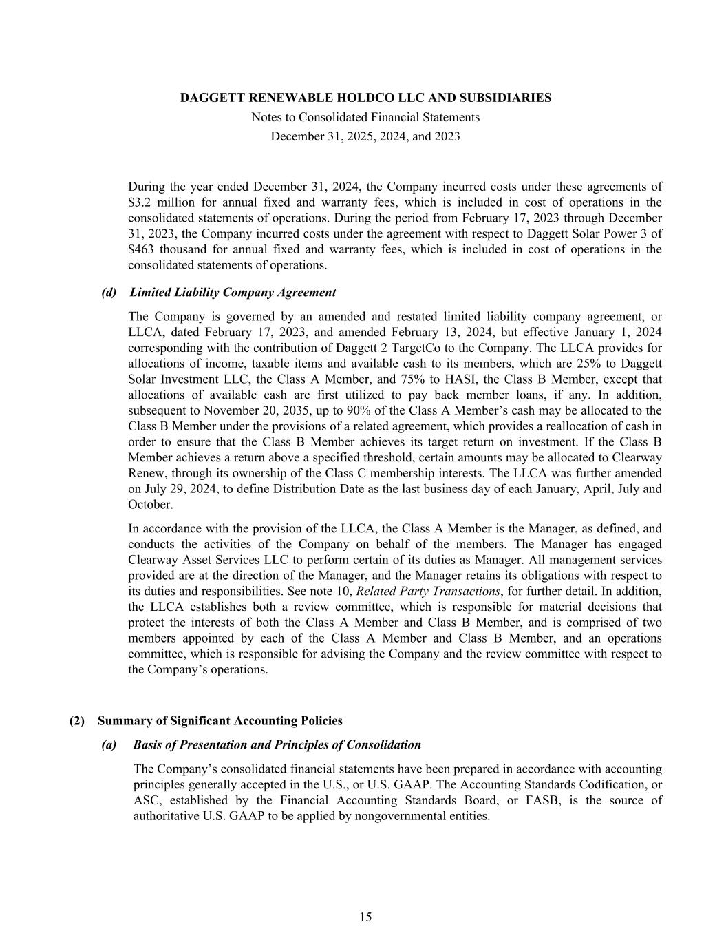 During the year ended December 31, 2024, the Company incurred costs under these agreements of $3.2 million for annual fixed and warranty fees, which is included in cost of operations in the consolidated statements of operations. During the period from February 17, 2023 through December 31, 2023, the Company incurred costs under the agreement with respect to Daggett Solar Power 3 of $463 thousand for annual fixed and warranty fees, which is included in cost of operations in the consolidated statements of operations. (d) Limited Liability Company Agreement The Company is governed by an amended and restated limited liability company agreement, or LLCA, dated February 17, 2023, and amended February 13, 2024, but effective January 1, 2024 corresponding with the contribution of Daggett 2 TargetCo to the Company. The LLCA provides for allocations of income, taxable items and available cash to its members, which are 25% to Daggett Solar Investment LLC, the Class A Member, and 75% to HASI, the Class B Member, except that allocations of available cash are first utilized to pay back member loans, if any. In addition, subsequent to November 20, 2035, up to 90% of the Class A Member’s cash may be allocated to the Class B Member under the provisions of a related agreement, which provides a reallocation of cash in order to ensure that the Class B Member achieves its target return on investment. If the Class B Member achieves a return above a specified threshold, certain amounts may be allocated to Clearway Renew, through its ownership of the Class C membership interests. The LLCA was further amended on July 29, 2024, to define Distribution Date as the last business day of each January, April, July and October. In accordance with the provision of the LLCA, the Class A Member is the Manager, as defined, and conducts the activities of the Company on behalf of the members. The Manager has engaged Clearway Asset Services LLC to perform certain of its duties as Manager. All management services provided are at the direction of the Manager, and the Manager retains its obligations with respect to its duties and responsibilities. See note 10, Related Party Transactions, for further detail. In addition, the LLCA establishes both a review committee, which is responsible for material decisions that protect the interests of both the Class A Member and Class B Member, and is comprised of two members appointed by each of the Class A Member and Class B Member, and an operations committee, which is responsible for advising the Company and the review committee with respect to the Company’s operations. (2) Summary of Significant Accounting Policies (a) Basis of Presentation and Principles of Consolidation The Company’s consolidated financial statements have been prepared in accordance with accounting principles generally accepted in the U.S., or U.S. GAAP. The Accounting Standards Codification, or ASC, established by the Financial Accounting Standards Board, or FASB, is the source of authoritative U.S. GAAP to be applied by nongovernmental entities. DAGGETT RENEWABLE HOLDCO LLC AND SUBSIDIARIES Notes to Consolidated Financial Statements December 31, 2025, 2024, and 2023 15
