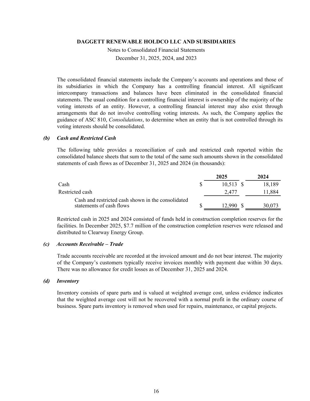 The consolidated financial statements include the Company’s accounts and operations and those of its subsidiaries in which the Company has a controlling financial interest. All significant intercompany transactions and balances have been eliminated in the consolidated financial statements. The usual condition for a controlling financial interest is ownership of the majority of the voting interests of an entity. However, a controlling financial interest may also exist through arrangements that do not involve controlling voting interests. As such, the Company applies the guidance of ASC 810, Consolidations, to determine when an entity that is not controlled through its voting interests should be consolidated. (b) Cash and Restricted Cash The following table provides a reconciliation of cash and restricted cash reported within the consolidated balance sheets that sum to the total of the same such amounts shown in the consolidated statements of cash flows as of December 31, 2025 and 2024 (in thousands): 2025 2024 Cash $ 10,513 $ 18,189 Restricted cash 2,477 11,884 Cash and restricted cash shown in the consolidated statements of cash flows $ 12,990 $ 30,073 Restricted cash in 2025 and 2024 consisted of funds held in construction completion reserves for the facilities. In December 2025, $7.7 million of the construction completion reserves were released and distributed to Clearway Energy Group. (c) Accounts Receivable – Trade Trade accounts receivable are recorded at the invoiced amount and do not bear interest. The majority of the Company’s customers typically receive invoices monthly with payment due within 30 days. There was no allowance for credit losses as of December 31, 2025 and 2024. (d) Inventory Inventory consists of spare parts and is valued at weighted average cost, unless evidence indicates that the weighted average cost will not be recovered with a normal profit in the ordinary course of business. Spare parts inventory is removed when used for repairs, maintenance, or capital projects. DAGGETT RENEWABLE HOLDCO LLC AND SUBSIDIARIES Notes to Consolidated Financial Statements December 31, 2025, 2024, and 2023 16
