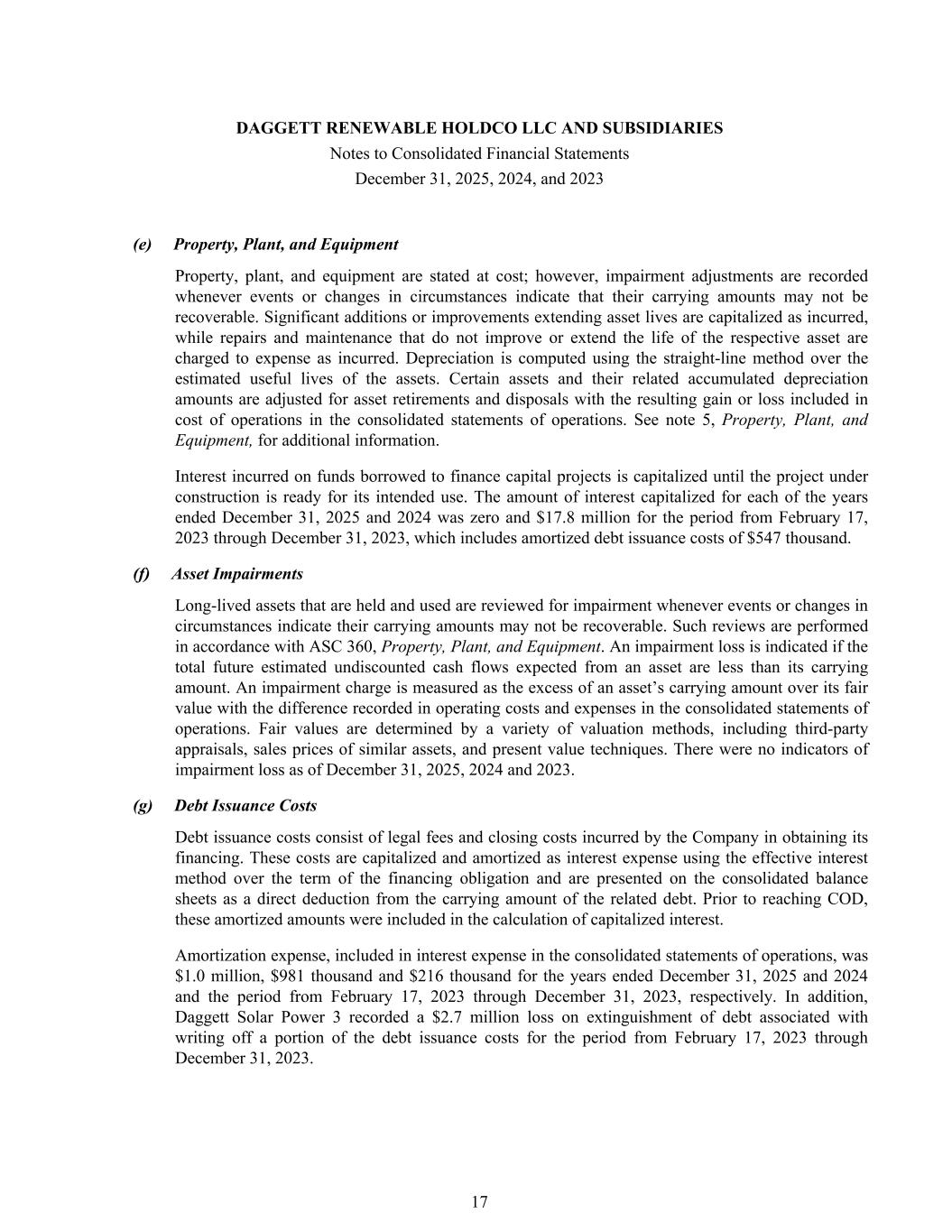 (e) Property, Plant, and Equipment Property, plant, and equipment are stated at cost; however, impairment adjustments are recorded whenever events or changes in circumstances indicate that their carrying amounts may not be recoverable. Significant additions or improvements extending asset lives are capitalized as incurred, while repairs and maintenance that do not improve or extend the life of the respective asset are charged to expense as incurred. Depreciation is computed using the straight-line method over the estimated useful lives of the assets. Certain assets and their related accumulated depreciation amounts are adjusted for asset retirements and disposals with the resulting gain or loss included in cost of operations in the consolidated statements of operations. See note 5, Property, Plant, and Equipment, for additional information. Interest incurred on funds borrowed to finance capital projects is capitalized until the project under construction is ready for its intended use. The amount of interest capitalized for each of the years ended December 31, 2025 and 2024 was zero and $17.8 million for the period from February 17, 2023 through December 31, 2023, which includes amortized debt issuance costs of $547 thousand. (f) Asset Impairments Long-lived assets that are held and used are reviewed for impairment whenever events or changes in circumstances indicate their carrying amounts may not be recoverable. Such reviews are performed in accordance with ASC 360, Property, Plant, and Equipment. An impairment loss is indicated if the total future estimated undiscounted cash flows expected from an asset are less than its carrying amount. An impairment charge is measured as the excess of an asset’s carrying amount over its fair value with the difference recorded in operating costs and expenses in the consolidated statements of operations. Fair values are determined by a variety of valuation methods, including third-party appraisals, sales prices of similar assets, and present value techniques. There were no indicators of impairment loss as of December 31, 2025, 2024 and 2023. (g) Debt Issuance Costs Debt issuance costs consist of legal fees and closing costs incurred by the Company in obtaining its financing. These costs are capitalized and amortized as interest expense using the effective interest method over the term of the financing obligation and are presented on the consolidated balance sheets as a direct deduction from the carrying amount of the related debt. Prior to reaching COD, these amortized amounts were included in the calculation of capitalized interest. Amortization expense, included in interest expense in the consolidated statements of operations, was $1.0 million, $981 thousand and $216 thousand for the years ended December 31, 2025 and 2024 and the period from February 17, 2023 through December 31, 2023, respectively. In addition, Daggett Solar Power 3 recorded a $2.7 million loss on extinguishment of debt associated with writing off a portion of the debt issuance costs for the period from February 17, 2023 through December 31, 2023. DAGGETT RENEWABLE HOLDCO LLC AND SUBSIDIARIES Notes to Consolidated Financial Statements December 31, 2025, 2024, and 2023 17