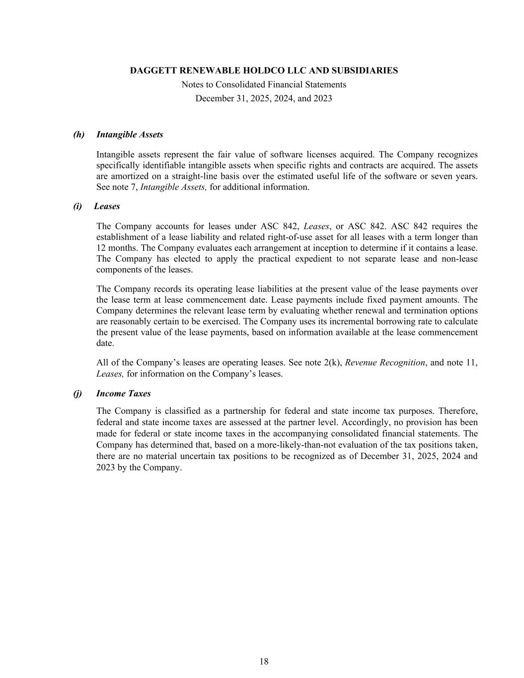 (h) Intangible Assets Intangible assets represent the fair value of software licenses acquired. The Company recognizes specifically identifiable intangible assets when specific rights and contracts are acquired. The assets are amortized on a straight-line basis over the estimated useful life of the software or seven years. See note 7, Intangible Assets, for additional information. (i) Leases The Company accounts for leases under ASC 842, Leases, or ASC 842. ASC 842 requires the establishment of a lease liability and related right-of-use asset for all leases with a term longer than 12 months. The Company evaluates each arrangement at inception to determine if it contains a lease. The Company has elected to apply the practical expedient to not separate lease and non-lease components of the leases. The Company records its operating lease liabilities at the present value of the lease payments over the lease term at lease commencement date. Lease payments include fixed payment amounts. The Company determines the relevant lease term by evaluating whether renewal and termination options are reasonably certain to be exercised. The Company uses its incremental borrowing rate to calculate the present value of the lease payments, based on information available at the lease commencement date. All of the Company’s leases are operating leases. See note 2(k), Revenue Recognition, and note 11, Leases, for information on the Company’s leases. (j) Income Taxes The Company is classified as a partnership for federal and state income tax purposes. Therefore, federal and state income taxes are assessed at the partner level. Accordingly, no provision has been made for federal or state income taxes in the accompanying consolidated financial statements. The Company has determined that, based on a more-likely-than-not evaluation of the tax positions taken, there are no material uncertain tax positions to be recognized as of December 31, 2025, 2024 and 2023 by the Company. DAGGETT RENEWABLE HOLDCO LLC AND SUBSIDIARIES Notes to Consolidated Financial Statements December 31, 2025, 2024, and 2023 18