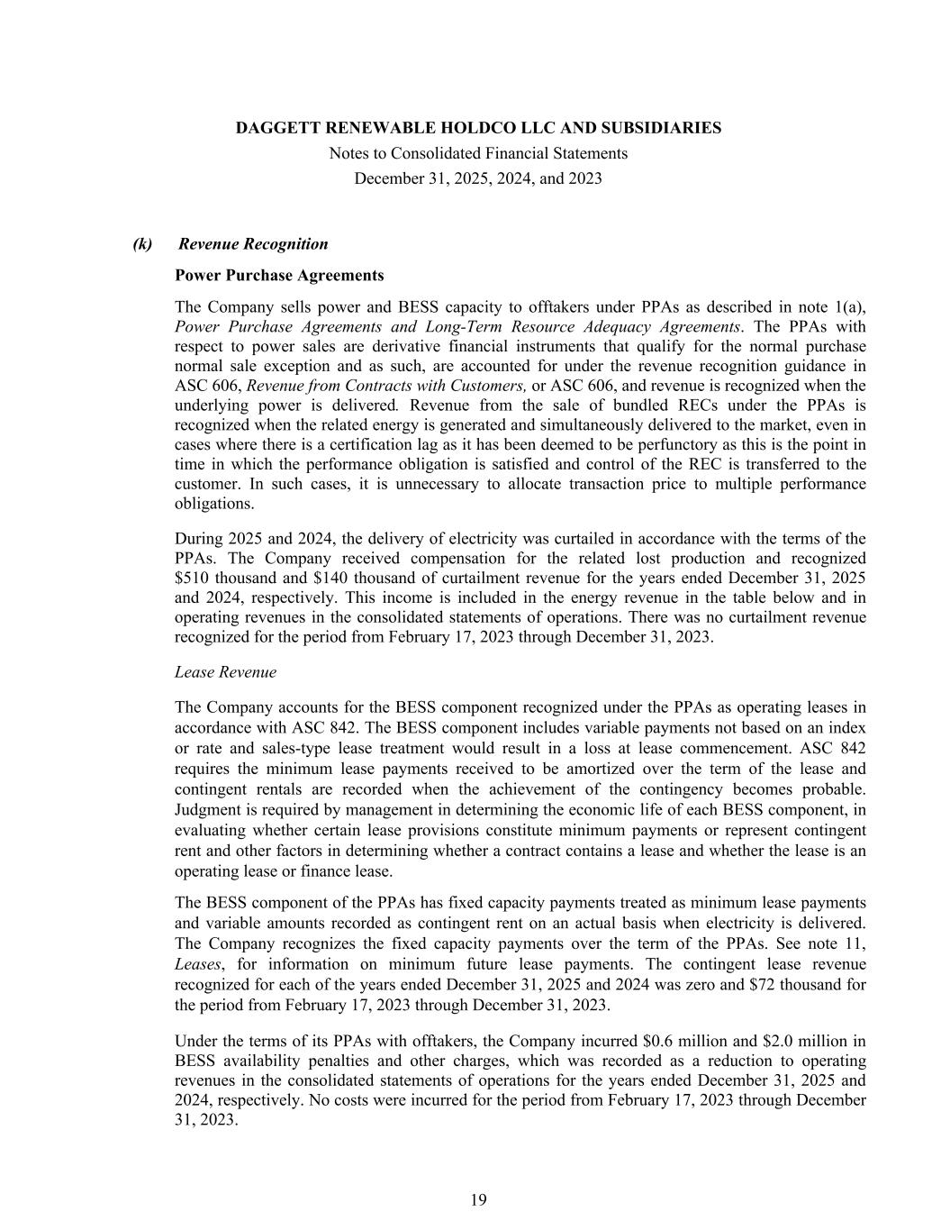 (k) Revenue Recognition Power Purchase Agreements The Company sells power and BESS capacity to offtakers under PPAs as described in note 1(a), Power Purchase Agreements and Long-Term Resource Adequacy Agreements. The PPAs with respect to power sales are derivative financial instruments that qualify for the normal purchase normal sale exception and as such, are accounted for under the revenue recognition guidance in ASC 606, Revenue from Contracts with Customers, or ASC 606, and revenue is recognized when the underlying power is delivered. Revenue from the sale of bundled RECs under the PPAs is recognized when the related energy is generated and simultaneously delivered to the market, even in cases where there is a certification lag as it has been deemed to be perfunctory as this is the point in time in which the performance obligation is satisfied and control of the REC is transferred to the customer. In such cases, it is unnecessary to allocate transaction price to multiple performance obligations. During 2025 and 2024, the delivery of electricity was curtailed in accordance with the terms of the PPAs. The Company received compensation for the related lost production and recognized $510 thousand and $140 thousand of curtailment revenue for the years ended December 31, 2025 and 2024, respectively. This income is included in the energy revenue in the table below and in operating revenues in the consolidated statements of operations. There was no curtailment revenue recognized for the period from February 17, 2023 through December 31, 2023. Lease Revenue The Company accounts for the BESS component recognized under the PPAs as operating leases in accordance with ASC 842. The BESS component includes variable payments not based on an index or rate and sales-type lease treatment would result in a loss at lease commencement. ASC 842 requires the minimum lease payments received to be amortized over the term of the lease and contingent rentals are recorded when the achievement of the contingency becomes probable. Judgment is required by management in determining the economic life of each BESS component, in evaluating whether certain lease provisions constitute minimum payments or represent contingent rent and other factors in determining whether a contract contains a lease and whether the lease is an operating lease or finance lease. The BESS component of the PPAs has fixed capacity payments treated as minimum lease payments and variable amounts recorded as contingent rent on an actual basis when electricity is delivered. The Company recognizes the fixed capacity payments over the term of the PPAs. See note 11, Leases, for information on minimum future lease payments. The contingent lease revenue recognized for each of the years ended December 31, 2025 and 2024 was zero and $72 thousand for the period from February 17, 2023 through December 31, 2023. Under the terms of its PPAs with offtakers, the Company incurred $0.6 million and $2.0 million in BESS availability penalties and other charges, which was recorded as a reduction to operating revenues in the consolidated statements of operations for the years ended December 31, 2025 and 2024, respectively. No costs were incurred for the period from February 17, 2023 through December 31, 2023. DAGGETT RENEWABLE HOLDCO LLC AND SUBSIDIARIES Notes to Consolidated Financial Statements December 31, 2025, 2024, and 2023 19