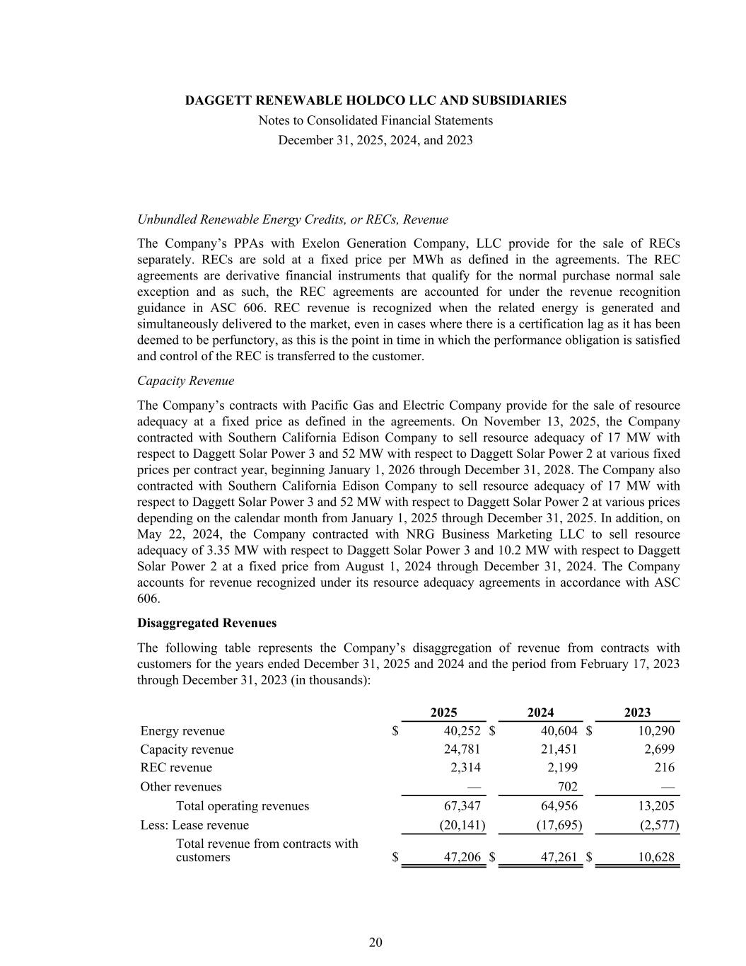Unbundled Renewable Energy Credits, or RECs, Revenue The Company’s PPAs with Exelon Generation Company, LLC provide for the sale of RECs separately. RECs are sold at a fixed price per MWh as defined in the agreements. The REC agreements are derivative financial instruments that qualify for the normal purchase normal sale exception and as such, the REC agreements are accounted for under the revenue recognition guidance in ASC 606. REC revenue is recognized when the related energy is generated and simultaneously delivered to the market, even in cases where there is a certification lag as it has been deemed to be perfunctory, as this is the point in time in which the performance obligation is satisfied and control of the REC is transferred to the customer. Capacity Revenue The Company’s contracts with Pacific Gas and Electric Company provide for the sale of resource adequacy at a fixed price as defined in the agreements. On November 13, 2025, the Company contracted with Southern California Edison Company to sell resource adequacy of 17 MW with respect to Daggett Solar Power 3 and 52 MW with respect to Daggett Solar Power 2 at various fixed prices per contract year, beginning January 1, 2026 through December 31, 2028. The Company also contracted with Southern California Edison Company to sell resource adequacy of 17 MW with respect to Daggett Solar Power 3 and 52 MW with respect to Daggett Solar Power 2 at various prices depending on the calendar month from January 1, 2025 through December 31, 2025. In addition, on May 22, 2024, the Company contracted with NRG Business Marketing LLC to sell resource adequacy of 3.35 MW with respect to Daggett Solar Power 3 and 10.2 MW with respect to Daggett Solar Power 2 at a fixed price from August 1, 2024 through December 31, 2024. The Company accounts for revenue recognized under its resource adequacy agreements in accordance with ASC 606. Disaggregated Revenues The following table represents the Company’s disaggregation of revenue from contracts with customers for the years ended December 31, 2025 and 2024 and the period from February 17, 2023 through December 31, 2023 (in thousands): 2025 2024 2023 Energy revenue $ 40,252 $ 40,604 $ 10,290 Capacity revenue 24,781 21,451 2,699 REC revenue 2,314 2,199 216 Other revenues — 702 — Total operating revenues 67,347 64,956 13,205 Less: Lease revenue (20,141) (17,695) (2,577) Total revenue from contracts with customers $ 47,206 $ 47,261 $ 10,628 DAGGETT RENEWABLE HOLDCO LLC AND SUBSIDIARIES Notes to Consolidated Financial Statements December 31, 2025, 2024, and 2023 20