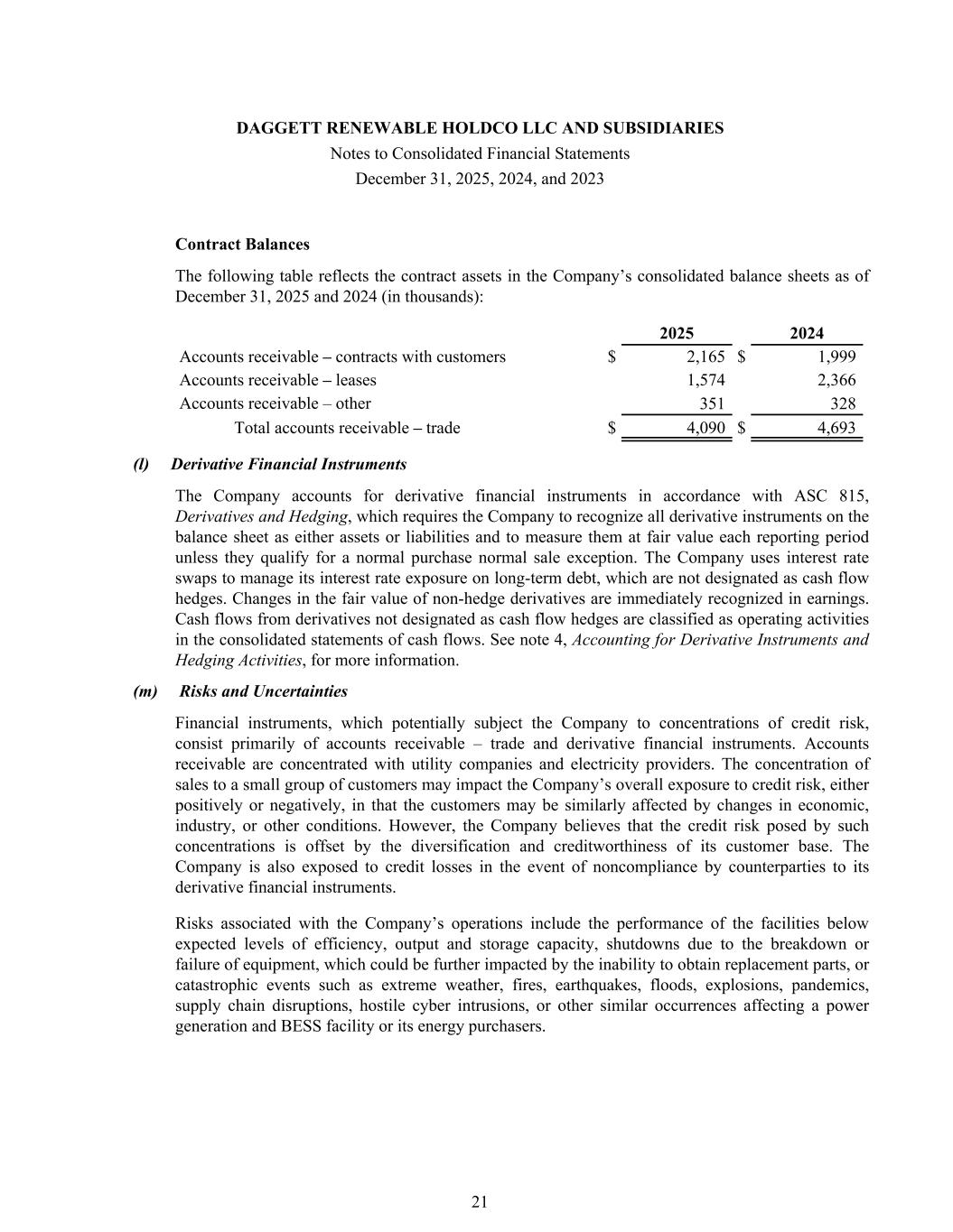 Contract Balances The following table reflects the contract assets in the Company’s consolidated balance sheets as of December 31, 2025 and 2024 (in thousands): 2025 2024 Accounts receivable – contracts with customers $ 2,165 $ 1,999 Accounts receivable – leases 1,574 2,366 Accounts receivable – other 351 328 Total accounts receivable – trade $ 4,090 $ 4,693 (l) Derivative Financial Instruments The Company accounts for derivative financial instruments in accordance with ASC 815, Derivatives and Hedging, which requires the Company to recognize all derivative instruments on the balance sheet as either assets or liabilities and to measure them at fair value each reporting period unless they qualify for a normal purchase normal sale exception. The Company uses interest rate swaps to manage its interest rate exposure on long-term debt, which are not designated as cash flow hedges. Changes in the fair value of non-hedge derivatives are immediately recognized in earnings. Cash flows from derivatives not designated as cash flow hedges are classified as operating activities in the consolidated statements of cash flows. See note 4, Accounting for Derivative Instruments and Hedging Activities, for more information. (m) Risks and Uncertainties Financial instruments, which potentially subject the Company to concentrations of credit risk, consist primarily of accounts receivable – trade and derivative financial instruments. Accounts receivable are concentrated with utility companies and electricity providers. The concentration of sales to a small group of customers may impact the Company’s overall exposure to credit risk, either positively or negatively, in that the customers may be similarly affected by changes in economic, industry, or other conditions. However, the Company believes that the credit risk posed by such concentrations is offset by the diversification and creditworthiness of its customer base. The Company is also exposed to credit losses in the event of noncompliance by counterparties to its derivative financial instruments. Risks associated with the Company’s operations include the performance of the facilities below expected levels of efficiency, output and storage capacity, shutdowns due to the breakdown or failure of equipment, which could be further impacted by the inability to obtain replacement parts, or catastrophic events such as extreme weather, fires, earthquakes, floods, explosions, pandemics, supply chain disruptions, hostile cyber intrusions, or other similar occurrences affecting a power generation and BESS facility or its energy purchasers. DAGGETT RENEWABLE HOLDCO LLC AND SUBSIDIARIES Notes to Consolidated Financial Statements December 31, 2025, 2024, and 2023 21