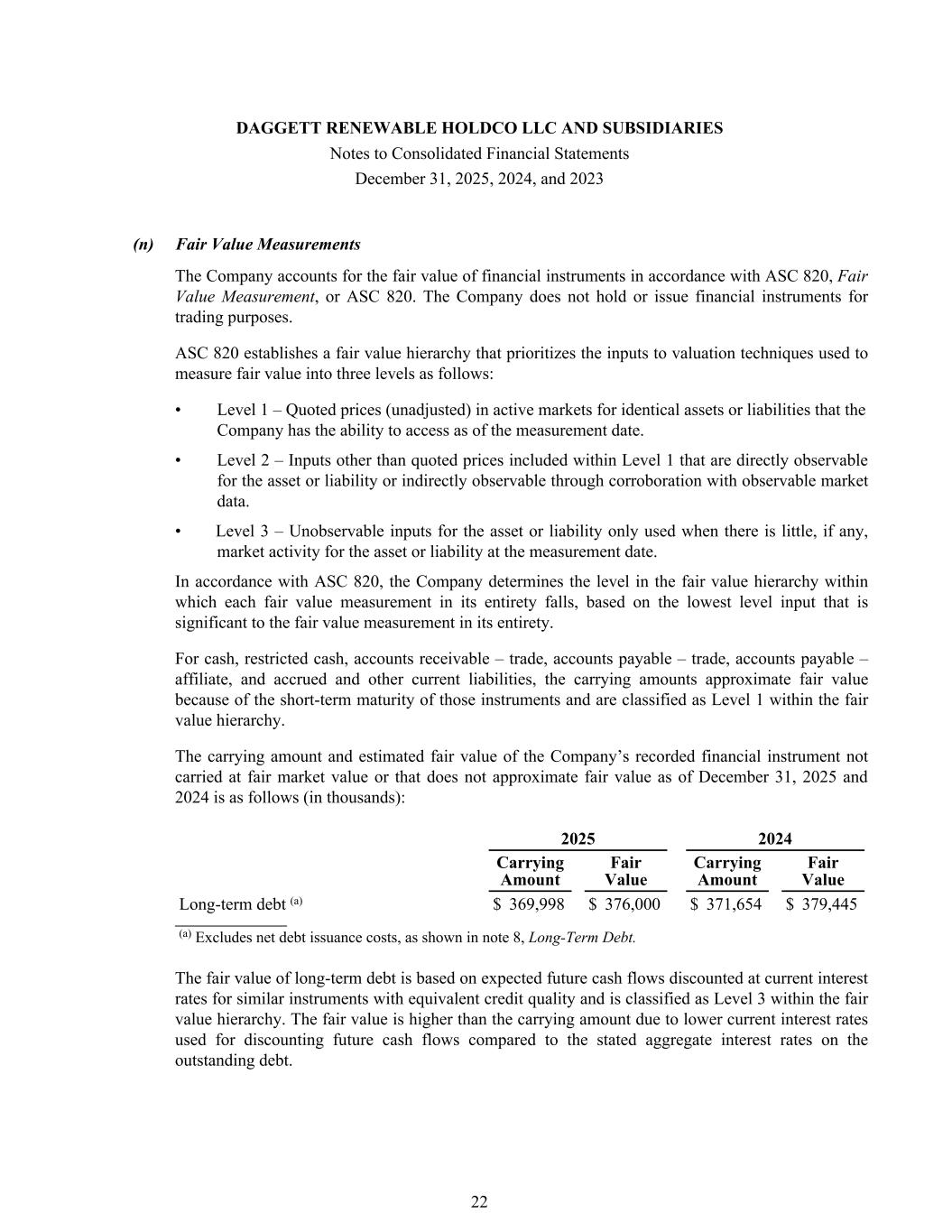 (n) Fair Value Measurements The Company accounts for the fair value of financial instruments in accordance with ASC 820, Fair Value Measurement, or ASC 820. The Company does not hold or issue financial instruments for trading purposes. ASC 820 establishes a fair value hierarchy that prioritizes the inputs to valuation techniques used to measure fair value into three levels as follows: • Level 1 – Quoted prices (unadjusted) in active markets for identical assets or liabilities that the Company has the ability to access as of the measurement date. • Level 2 – Inputs other than quoted prices included within Level 1 that are directly observable for the asset or liability or indirectly observable through corroboration with observable market data. • Level 3 – Unobservable inputs for the asset or liability only used when there is little, if any, market activity for the asset or liability at the measurement date. In accordance with ASC 820, the Company determines the level in the fair value hierarchy within which each fair value measurement in its entirety falls, based on the lowest level input that is significant to the fair value measurement in its entirety. For cash, restricted cash, accounts receivable – trade, accounts payable – trade, accounts payable – affiliate, and accrued and other current liabilities, the carrying amounts approximate fair value because of the short-term maturity of those instruments and are classified as Level 1 within the fair value hierarchy. The carrying amount and estimated fair value of the Company’s recorded financial instrument not carried at fair market value or that does not approximate fair value as of December 31, 2025 and 2024 is as follows (in thousands): 2025 2024 Carrying Amount Fair Value Carrying Amount Fair Value Long-term debt (a) $ 369,998 $ 376,000 $ 371,654 $ 379,445 (a) Excludes net debt issuance costs, as shown in note 8, Long-Term Debt. The fair value of long-term debt is based on expected future cash flows discounted at current interest rates for similar instruments with equivalent credit quality and is classified as Level 3 within the fair value hierarchy. The fair value is higher than the carrying amount due to lower current interest rates used for discounting future cash flows compared to the stated aggregate interest rates on the outstanding debt. DAGGETT RENEWABLE HOLDCO LLC AND SUBSIDIARIES Notes to Consolidated Financial Statements December 31, 2025, 2024, and 2023 22