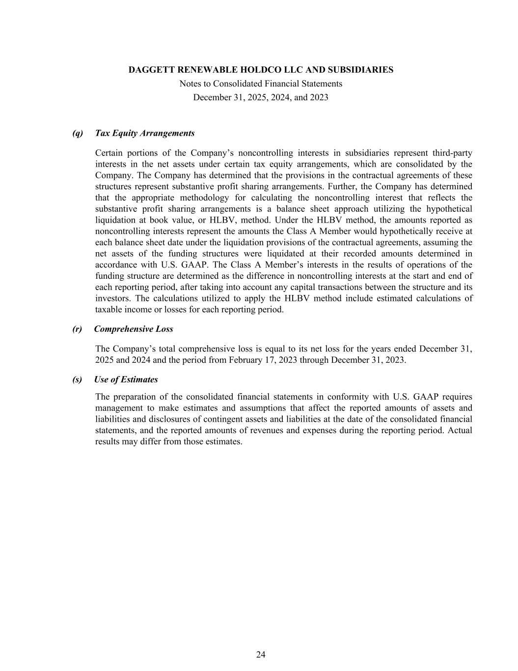 (q) Tax Equity Arrangements Certain portions of the Company’s noncontrolling interests in subsidiaries represent third-party interests in the net assets under certain tax equity arrangements, which are consolidated by the Company. The Company has determined that the provisions in the contractual agreements of these structures represent substantive profit sharing arrangements. Further, the Company has determined that the appropriate methodology for calculating the noncontrolling interest that reflects the substantive profit sharing arrangements is a balance sheet approach utilizing the hypothetical liquidation at book value, or HLBV, method. Under the HLBV method, the amounts reported as noncontrolling interests represent the amounts the Class A Member would hypothetically receive at each balance sheet date under the liquidation provisions of the contractual agreements, assuming the net assets of the funding structures were liquidated at their recorded amounts determined in accordance with U.S. GAAP. The Class A Member’s interests in the results of operations of the funding structure are determined as the difference in noncontrolling interests at the start and end of each reporting period, after taking into account any capital transactions between the structure and its investors. The calculations utilized to apply the HLBV method include estimated calculations of taxable income or losses for each reporting period. (r) Comprehensive Loss The Company’s total comprehensive loss is equal to its net loss for the years ended December 31, 2025 and 2024 and the period from February 17, 2023 through December 31, 2023. (s) Use of Estimates The preparation of the consolidated financial statements in conformity with U.S. GAAP requires management to make estimates and assumptions that affect the reported amounts of assets and liabilities and disclosures of contingent assets and liabilities at the date of the consolidated financial statements, and the reported amounts of revenues and expenses during the reporting period. Actual results may differ from those estimates. DAGGETT RENEWABLE HOLDCO LLC AND SUBSIDIARIES Notes to Consolidated Financial Statements December 31, 2025, 2024, and 2023 24