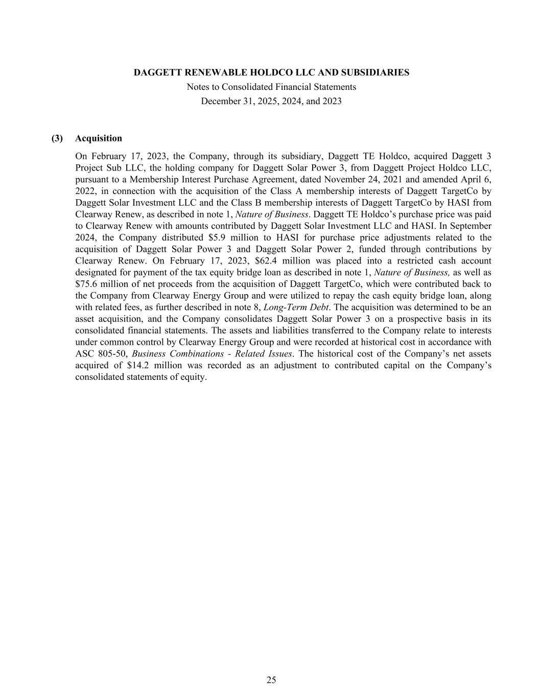 (3) Acquisition On February 17, 2023, the Company, through its subsidiary, Daggett TE Holdco, acquired Daggett 3 Project Sub LLC, the holding company for Daggett Solar Power 3, from Daggett Project Holdco LLC, pursuant to a Membership Interest Purchase Agreement, dated November 24, 2021 and amended April 6, 2022, in connection with the acquisition of the Class A membership interests of Daggett TargetCo by Daggett Solar Investment LLC and the Class B membership interests of Daggett TargetCo by HASI from Clearway Renew, as described in note 1, Nature of Business. Daggett TE Holdco’s purchase price was paid to Clearway Renew with amounts contributed by Daggett Solar Investment LLC and HASI. In September 2024, the Company distributed $5.9 million to HASI for purchase price adjustments related to the acquisition of Daggett Solar Power 3 and Daggett Solar Power 2, funded through contributions by Clearway Renew. On February 17, 2023, $62.4 million was placed into a restricted cash account designated for payment of the tax equity bridge loan as described in note 1, Nature of Business, as well as $75.6 million of net proceeds from the acquisition of Daggett TargetCo, which were contributed back to the Company from Clearway Energy Group and were utilized to repay the cash equity bridge loan, along with related fees, as further described in note 8, Long-Term Debt. The acquisition was determined to be an asset acquisition, and the Company consolidates Daggett Solar Power 3 on a prospective basis in its consolidated financial statements. The assets and liabilities transferred to the Company relate to interests under common control by Clearway Energy Group and were recorded at historical cost in accordance with ASC 805-50, Business Combinations - Related Issues. The historical cost of the Company’s net assets acquired of $14.2 million was recorded as an adjustment to contributed capital on the Company’s consolidated statements of equity. DAGGETT RENEWABLE HOLDCO LLC AND SUBSIDIARIES Notes to Consolidated Financial Statements December 31, 2025, 2024, and 2023 25