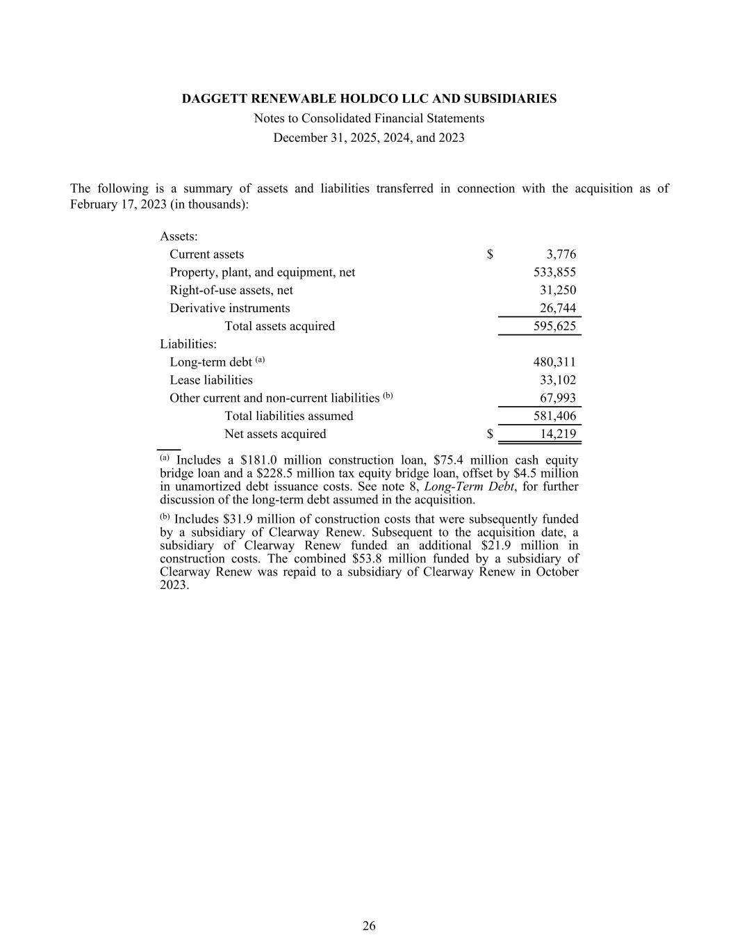 The following is a summary of assets and liabilities transferred in connection with the acquisition as of February 17, 2023 (in thousands): Assets: Current assets $ 3,776 Property, plant, and equipment, net 533,855 Right-of-use assets, net 31,250 Derivative instruments 26,744 Total assets acquired 595,625 Liabilities: Long-term debt (a) 480,311 Lease liabilities 33,102 Other current and non-current liabilities (b) 67,993 Total liabilities assumed 581,406 Net assets acquired $ 14,219 (a) Includes a $181.0 million construction loan, $75.4 million cash equity bridge loan and a $228.5 million tax equity bridge loan, offset by $4.5 million in unamortized debt issuance costs. See note 8, Long-Term Debt, for further discussion of the long-term debt assumed in the acquisition. (b) Includes $31.9 million of construction costs that were subsequently funded by a subsidiary of Clearway Renew. Subsequent to the acquisition date, a subsidiary of Clearway Renew funded an additional $21.9 million in construction costs. The combined $53.8 million funded by a subsidiary of Clearway Renew was repaid to a subsidiary of Clearway Renew in October 2023. DAGGETT RENEWABLE HOLDCO LLC AND SUBSIDIARIES Notes to Consolidated Financial Statements December 31, 2025, 2024, and 2023 26
