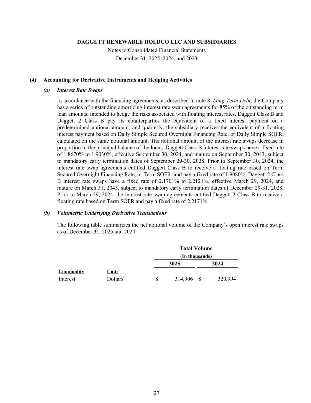 (4) Accounting for Derivative Instruments and Hedging Activities (a) Interest Rate Swaps In accordance with the financing agreements, as described in note 8, Long-Term Debt, the Company has a series of outstanding amortizing interest rate swap agreements for 85% of the outstanding term loan amounts, intended to hedge the risks associated with floating interest rates. Daggett Class B and Daggett 2 Class B pay its counterparties the equivalent of a fixed interest payment on a predetermined notional amount, and quarterly, the subsidiary receives the equivalent of a floating interest payment based on Daily Simple Secured Overnight Financing Rate, or Daily Simple SOFR, calculated on the same notional amount. The notional amount of the interest rate swaps decrease in proportion to the principal balance of the loans. Daggett Class B interest rate swaps have a fixed rate of 1.8670% to 1.9030%, effective September 30, 2024, and mature on September 30, 2043, subject to mandatory early termination dates of September 29-30, 2028. Prior to September 30, 2024, the interest rate swap agreements entitled Daggett Class B to receive a floating rate based on Term Secured Overnight Financing Rate, or Term SOFR, and pay a fixed rate of 1.9080%. Daggett 2 Class B interest rate swaps have a fixed rate of 2.1701% to 2.2121%, effective March 29, 2024, and mature on March 31, 2043, subject to mandatory early termination dates of December 29-31, 2028. Prior to March 29, 2024, the interest rate swap agreements entitled Daggett 2 Class B to receive a floating rate based on Term SOFR and pay a fixed rate of 2.2171%. (b) Volumetric Underlying Derivative Transactions The following table summarizes the net notional volume of the Company’s open interest rate swaps as of December 31, 2025 and 2024: Total Volume (In thousands) 2025 2024 Commodity Units Interest Dollars $ 314,906 $ 320,994 DAGGETT RENEWABLE HOLDCO LLC AND SUBSIDIARIES Notes to Consolidated Financial Statements December 31, 2025, 2024, and 2023 27