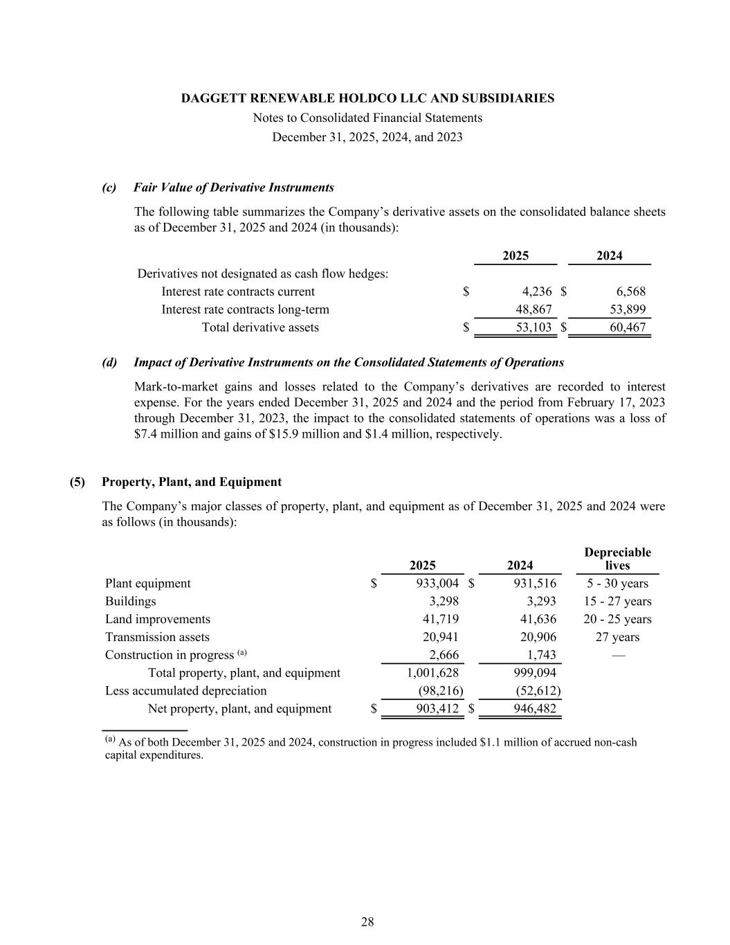 (c) Fair Value of Derivative Instruments The following table summarizes the Company’s derivative assets on the consolidated balance sheets as of December 31, 2025 and 2024 (in thousands): 2025 2024 Derivatives not designated as cash flow hedges: Interest rate contracts current $ 4,236 $ 6,568 Interest rate contracts long-term 48,867 53,899 Total derivative assets $ 53,103 $ 60,467 (d) Impact of Derivative Instruments on the Consolidated Statements of Operations Mark-to-market gains and losses related to the Company’s derivatives are recorded to interest expense. For the years ended December 31, 2025 and 2024 and the period from February 17, 2023 through December 31, 2023, the impact to the consolidated statements of operations was a loss of $7.4 million and gains of $15.9 million and $1.4 million, respectively. (5) Property, Plant, and Equipment The Company’s major classes of property, plant, and equipment as of December 31, 2025 and 2024 were as follows (in thousands): 2025 2024 Depreciable lives Plant equipment $ 933,004 $ 931,516 5 - 30 years Buildings 3,298 3,293 15 - 27 years Land improvements 41,719 41,636 20 - 25 years Transmission assets 20,941 20,906 27 years Construction in progress (a) 2,666 1,743 — Total property, plant, and equipment 1,001,628 999,094 Less accumulated depreciation (98,216) (52,612) Net property, plant, and equipment $ 903,412 $ 946,482 (a) As of both December 31, 2025 and 2024, construction in progress included $1.1 million of accrued non-cash capital expenditures. DAGGETT RENEWABLE HOLDCO LLC AND SUBSIDIARIES Notes to Consolidated Financial Statements December 31, 2025, 2024, and 2023 28