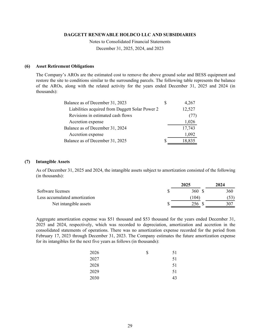 (6) Asset Retirement Obligations The Company’s AROs are the estimated cost to remove the above ground solar and BESS equipment and restore the site to conditions similar to the surrounding parcels. The following table represents the balance of the AROs, along with the related activity for the years ended December 31, 2025 and 2024 (in thousands): Balance as of December 31, 2023 $ 4,267 Liabilities acquired from Daggett Solar Power 2 12,527 Revisions in estimated cash flows (77) Accretion expense 1,026 Balance as of December 31, 2024 17,743 Accretion expense 1,092 Balance as of December 31, 2025 $ 18,835 (7) Intangible Assets As of December 31, 2025 and 2024, the intangible assets subject to amortization consisted of the following (in thousands): 2025 2024 Software licenses $ 360 $ 360 Less accumulated amortization (104) (53) Net intangible assets $ 256 $ 307 Aggregate amortization expense was $51 thousand and $53 thousand for the years ended December 31, 2025 and 2024, respectively, which was recorded to depreciation, amortization and accretion in the consolidated statements of operations. There was no amortization expense recorded for the period from February 17, 2023 through December 31, 2023. The Company estimates the future amortization expense for its intangibles for the next five years as follows (in thousands): 2026 $ 51 2027 51 2028 51 2029 51 2030 43 DAGGETT RENEWABLE HOLDCO LLC AND SUBSIDIARIES Notes to Consolidated Financial Statements December 31, 2025, 2024, and 2023 29
