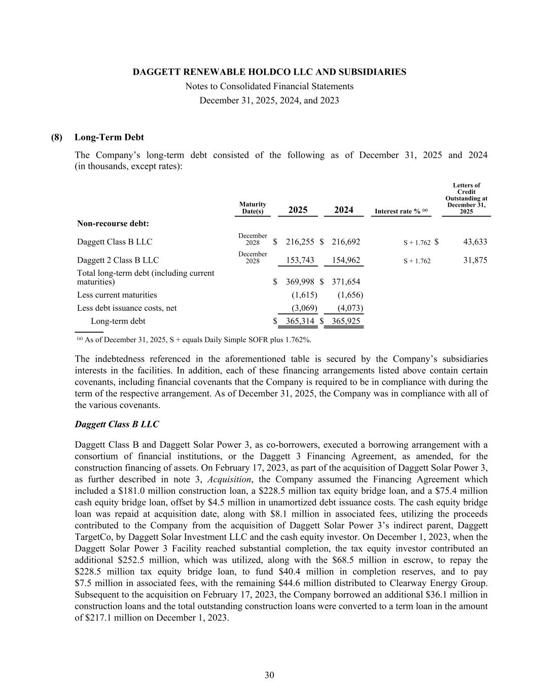 (8) Long-Term Debt The Company’s long-term debt consisted of the following as of December 31, 2025 and 2024 (in thousands, except rates): Maturity Date(s) 2025 2024 Interest rate % (a) Letters of Credit Outstanding at December 31, 2025 Non-recourse debt: Daggett Class B LLC December 2028 $ 216,255 $ 216,692 S + 1.762 $ 43,633 Daggett 2 Class B LLC December 2028 153,743 154,962 S + 1.762 31,875 Total long-term debt (including current maturities) $ 369,998 $ 371,654 Less current maturities (1,615) (1,656) Less debt issuance costs, net (3,069) (4,073) Long-term debt $ 365,314 $ 365,925 (a) As of December 31, 2025, S + equals Daily Simple SOFR plus 1.762%. The indebtedness referenced in the aforementioned table is secured by the Company’s subsidiaries interests in the facilities. In addition, each of these financing arrangements listed above contain certain covenants, including financial covenants that the Company is required to be in compliance with during the term of the respective arrangement. As of December 31, 2025, the Company was in compliance with all of the various covenants. Daggett Class B LLC Daggett Class B and Daggett Solar Power 3, as co-borrowers, executed a borrowing arrangement with a consortium of financial institutions, or the Daggett 3 Financing Agreement, as amended, for the construction financing of assets. On February 17, 2023, as part of the acquisition of Daggett Solar Power 3, as further described in note 3, Acquisition, the Company assumed the Financing Agreement which included a $181.0 million construction loan, a $228.5 million tax equity bridge loan, and a $75.4 million cash equity bridge loan, offset by $4.5 million in unamortized debt issuance costs. The cash equity bridge loan was repaid at acquisition date, along with $8.1 million in associated fees, utilizing the proceeds contributed to the Company from the acquisition of Daggett Solar Power 3’s indirect parent, Daggett TargetCo, by Daggett Solar Investment LLC and the cash equity investor. On December 1, 2023, when the Daggett Solar Power 3 Facility reached substantial completion, the tax equity investor contributed an additional $252.5 million, which was utilized, along with the $68.5 million in escrow, to repay the $228.5 million tax equity bridge loan, to fund $40.4 million in completion reserves, and to pay $7.5 million in associated fees, with the remaining $44.6 million distributed to Clearway Energy Group. Subsequent to the acquisition on February 17, 2023, the Company borrowed an additional $36.1 million in construction loans and the total outstanding construction loans were converted to a term loan in the amount of $217.1 million on December 1, 2023. DAGGETT RENEWABLE HOLDCO LLC AND SUBSIDIARIES Notes to Consolidated Financial Statements December 31, 2025, 2024, and 2023 30