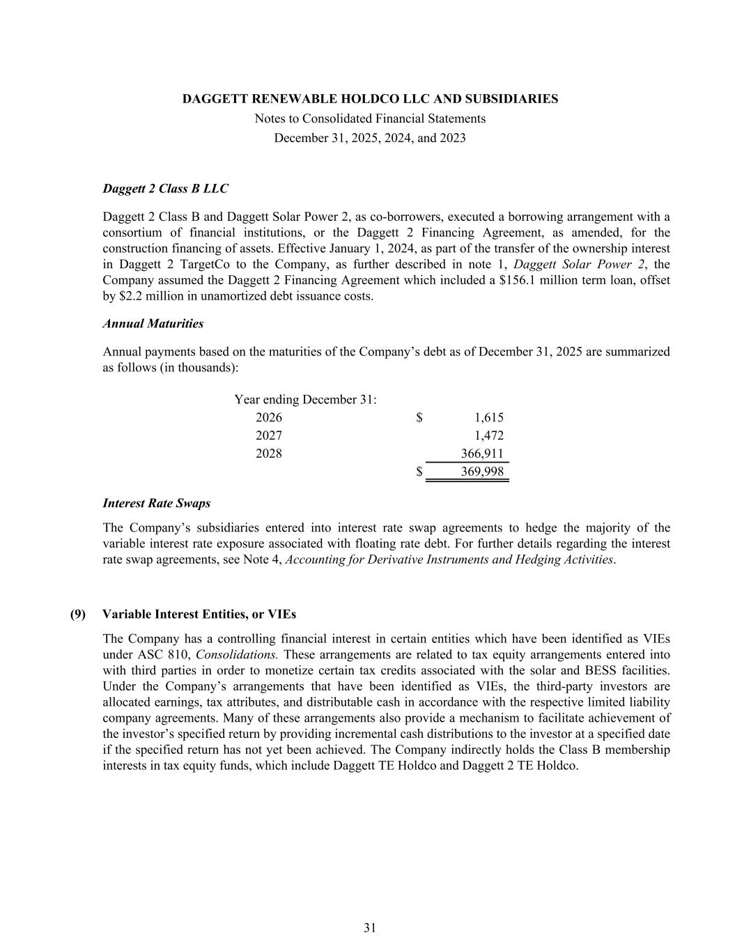 Daggett 2 Class B LLC Daggett 2 Class B and Daggett Solar Power 2, as co-borrowers, executed a borrowing arrangement with a consortium of financial institutions, or the Daggett 2 Financing Agreement, as amended, for the construction financing of assets. Effective January 1, 2024, as part of the transfer of the ownership interest in Daggett 2 TargetCo to the Company, as further described in note 1, Daggett Solar Power 2, the Company assumed the Daggett 2 Financing Agreement which included a $156.1 million term loan, offset by $2.2 million in unamortized debt issuance costs. Annual Maturities Annual payments based on the maturities of the Company’s debt as of December 31, 2025 are summarized as follows (in thousands): Year ending December 31: 2026 $ 1,615 2027 1,472 2028 366,911 $ 369,998 Interest Rate Swaps The Company’s subsidiaries entered into interest rate swap agreements to hedge the majority of the variable interest rate exposure associated with floating rate debt. For further details regarding the interest rate swap agreements, see Note 4, Accounting for Derivative Instruments and Hedging Activities. (9) Variable Interest Entities, or VIEs The Company has a controlling financial interest in certain entities which have been identified as VIEs under ASC 810, Consolidations. These arrangements are related to tax equity arrangements entered into with third parties in order to monetize certain tax credits associated with the solar and BESS facilities. Under the Company’s arrangements that have been identified as VIEs, the third-party investors are allocated earnings, tax attributes, and distributable cash in accordance with the respective limited liability company agreements. Many of these arrangements also provide a mechanism to facilitate achievement of the investor’s specified return by providing incremental cash distributions to the investor at a specified date if the specified return has not yet been achieved. The Company indirectly holds the Class B membership interests in tax equity funds, which include Daggett TE Holdco and Daggett 2 TE Holdco. DAGGETT RENEWABLE HOLDCO LLC AND SUBSIDIARIES Notes to Consolidated Financial Statements December 31, 2025, 2024, and 2023 31