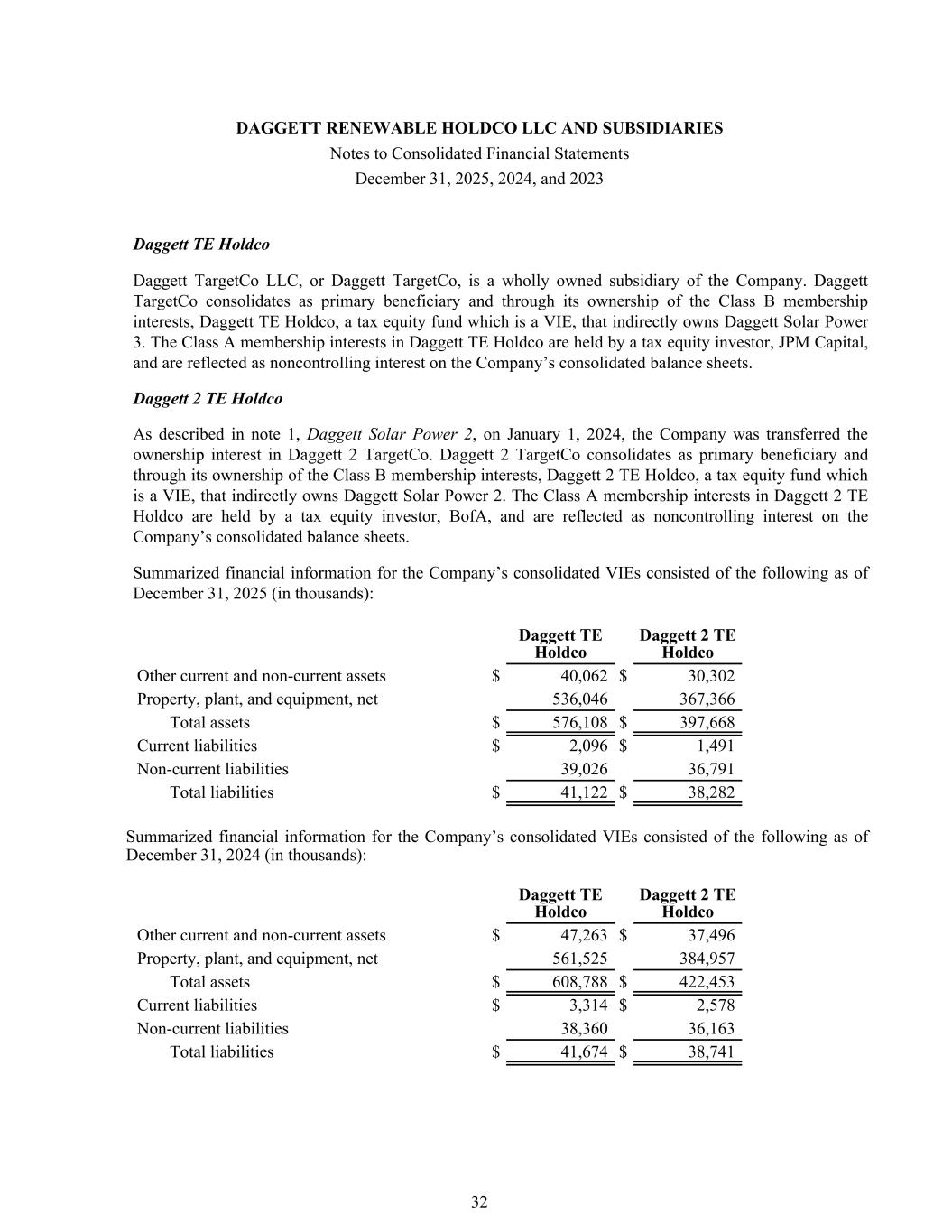 Daggett TE Holdco Daggett TargetCo LLC, or Daggett TargetCo, is a wholly owned subsidiary of the Company. Daggett TargetCo consolidates as primary beneficiary and through its ownership of the Class B membership interests, Daggett TE Holdco, a tax equity fund which is a VIE, that indirectly owns Daggett Solar Power 3. The Class A membership interests in Daggett TE Holdco are held by a tax equity investor, JPM Capital, and are reflected as noncontrolling interest on the Company’s consolidated balance sheets. Daggett 2 TE Holdco As described in note 1, Daggett Solar Power 2, on January 1, 2024, the Company was transferred the ownership interest in Daggett 2 TargetCo. Daggett 2 TargetCo consolidates as primary beneficiary and through its ownership of the Class B membership interests, Daggett 2 TE Holdco, a tax equity fund which is a VIE, that indirectly owns Daggett Solar Power 2. The Class A membership interests in Daggett 2 TE Holdco are held by a tax equity investor, BofA, and are reflected as noncontrolling interest on the Company’s consolidated balance sheets. Summarized financial information for the Company’s consolidated VIEs consisted of the following as of December 31, 2025 (in thousands): Daggett TE Holdco Daggett 2 TE Holdco Other current and non-current assets $ 40,062 $ 30,302 Property, plant, and equipment, net 536,046 367,366 Total assets $ 576,108 $ 397,668 Current liabilities $ 2,096 $ 1,491 Non-current liabilities 39,026 36,791 Total liabilities $ 41,122 $ 38,282 Summarized financial information for the Company’s consolidated VIEs consisted of the following as of December 31, 2024 (in thousands): Daggett TE Holdco Daggett 2 TE Holdco Other current and non-current assets $ 47,263 $ 37,496 Property, plant, and equipment, net 561,525 384,957 Total assets $ 608,788 $ 422,453 Current liabilities $ 3,314 $ 2,578 Non-current liabilities 38,360 36,163 Total liabilities $ 41,674 $ 38,741 DAGGETT RENEWABLE HOLDCO LLC AND SUBSIDIARIES Notes to Consolidated Financial Statements December 31, 2025, 2024, and 2023 32