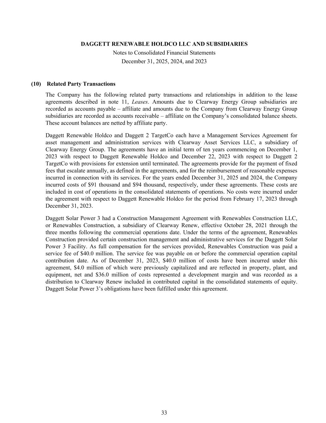 (10) Related Party Transactions The Company has the following related party transactions and relationships in addition to the lease agreements described in note 11, Leases. Amounts due to Clearway Energy Group subsidiaries are recorded as accounts payable – affiliate and amounts due to the Company from Clearway Energy Group subsidiaries are recorded as accounts receivable – affiliate on the Company’s consolidated balance sheets. These account balances are netted by affiliate party. Daggett Renewable Holdco and Daggett 2 TargetCo each have a Management Services Agreement for asset management and administration services with Clearway Asset Services LLC, a subsidiary of Clearway Energy Group. The agreements have an initial term of ten years commencing on December 1, 2023 with respect to Daggett Renewable Holdco and December 22, 2023 with respect to Daggett 2 TargetCo with provisions for extension until terminated. The agreements provide for the payment of fixed fees that escalate annually, as defined in the agreements, and for the reimbursement of reasonable expenses incurred in connection with its services. For the years ended December 31, 2025 and 2024, the Company incurred costs of $91 thousand and $94 thousand, respectively, under these agreements. These costs are included in cost of operations in the consolidated statements of operations. No costs were incurred under the agreement with respect to Daggett Renewable Holdco for the period from February 17, 2023 through December 31, 2023. Daggett Solar Power 3 had a Construction Management Agreement with Renewables Construction LLC, or Renewables Construction, a subsidiary of Clearway Renew, effective October 28, 2021 through the three months following the commercial operations date. Under the terms of the agreement, Renewables Construction provided certain construction management and administrative services for the Daggett Solar Power 3 Facility. As full compensation for the services provided, Renewables Construction was paid a service fee of $40.0 million. The service fee was payable on or before the commercial operation capital contribution date. As of December 31, 2023, $40.0 million of costs have been incurred under this agreement, $4.0 million of which were previously capitalized and are reflected in property, plant, and equipment, net and $36.0 million of costs represented a development margin and was recorded as a distribution to Clearway Renew included in contributed capital in the consolidated statements of equity. Daggett Solar Power 3’s obligations have been fulfilled under this agreement. DAGGETT RENEWABLE HOLDCO LLC AND SUBSIDIARIES Notes to Consolidated Financial Statements December 31, 2025, 2024, and 2023 33
