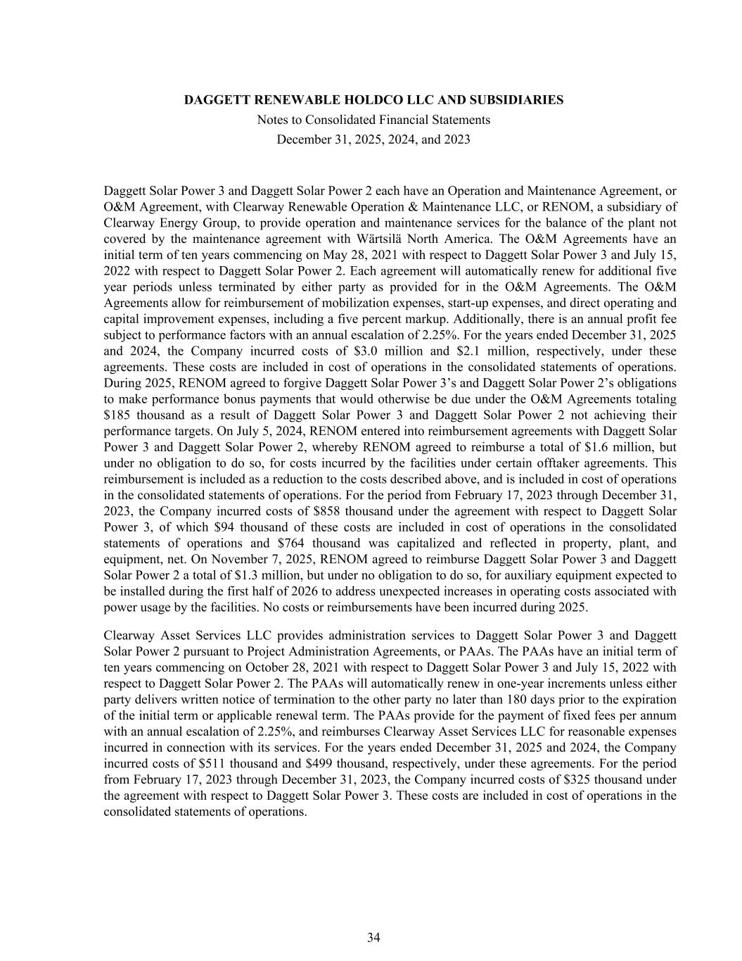 Daggett Solar Power 3 and Daggett Solar Power 2 each have an Operation and Maintenance Agreement, or O&M Agreement, with Clearway Renewable Operation & Maintenance LLC, or RENOM, a subsidiary of Clearway Energy Group, to provide operation and maintenance services for the balance of the plant not covered by the maintenance agreement with Wärtsilä North America. The O&M Agreements have an initial term of ten years commencing on May 28, 2021 with respect to Daggett Solar Power 3 and July 15, 2022 with respect to Daggett Solar Power 2. Each agreement will automatically renew for additional five year periods unless terminated by either party as provided for in the O&M Agreements. The O&M Agreements allow for reimbursement of mobilization expenses, start-up expenses, and direct operating and capital improvement expenses, including a five percent markup. Additionally, there is an annual profit fee subject to performance factors with an annual escalation of 2.25%. For the years ended December 31, 2025 and 2024, the Company incurred costs of $3.0 million and $2.1 million, respectively, under these agreements. These costs are included in cost of operations in the consolidated statements of operations. During 2025, RENOM agreed to forgive Daggett Solar Power 3’s and Daggett Solar Power 2’s obligations to make performance bonus payments that would otherwise be due under the O&M Agreements totaling $185 thousand as a result of Daggett Solar Power 3 and Daggett Solar Power 2 not achieving their performance targets. On July 5, 2024, RENOM entered into reimbursement agreements with Daggett Solar Power 3 and Daggett Solar Power 2, whereby RENOM agreed to reimburse a total of $1.6 million, but under no obligation to do so, for costs incurred by the facilities under certain offtaker agreements. This reimbursement is included as a reduction to the costs described above, and is included in cost of operations in the consolidated statements of operations. For the period from February 17, 2023 through December 31, 2023, the Company incurred costs of $858 thousand under the agreement with respect to Daggett Solar Power 3, of which $94 thousand of these costs are included in cost of operations in the consolidated statements of operations and $764 thousand was capitalized and reflected in property, plant, and equipment, net. On November 7, 2025, RENOM agreed to reimburse Daggett Solar Power 3 and Daggett Solar Power 2 a total of $1.3 million, but under no obligation to do so, for auxiliary equipment expected to be installed during the first half of 2026 to address unexpected increases in operating costs associated with power usage by the facilities. No costs or reimbursements have been incurred during 2025. Clearway Asset Services LLC provides administration services to Daggett Solar Power 3 and Daggett Solar Power 2 pursuant to Project Administration Agreements, or PAAs. The PAAs have an initial term of ten years commencing on October 28, 2021 with respect to Daggett Solar Power 3 and July 15, 2022 with respect to Daggett Solar Power 2. The PAAs will automatically renew in one-year increments unless either party delivers written notice of termination to the other party no later than 180 days prior to the expiration of the initial term or applicable renewal term. The PAAs provide for the payment of fixed fees per annum with an annual escalation of 2.25%, and reimburses Clearway Asset Services LLC for reasonable expenses incurred in connection with its services. For the years ended December 31, 2025 and 2024, the Company incurred costs of $511 thousand and $499 thousand, respectively, under these agreements. For the period from February 17, 2023 through December 31, 2023, the Company incurred costs of $325 thousand under the agreement with respect to Daggett Solar Power 3. These costs are included in cost of operations in the consolidated statements of operations. DAGGETT RENEWABLE HOLDCO LLC AND SUBSIDIARIES Notes to Consolidated Financial Statements December 31, 2025, 2024, and 2023 34
