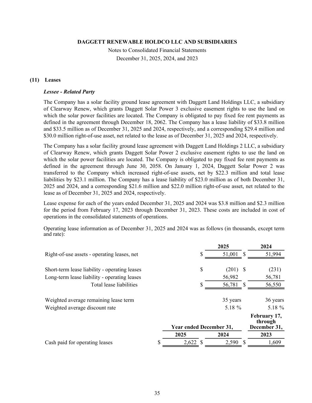 (11) Leases Lessee - Related Party The Company has a solar facility ground lease agreement with Daggett Land Holdings LLC, a subsidiary of Clearway Renew, which grants Daggett Solar Power 3 exclusive easement rights to use the land on which the solar power facilities are located. The Company is obligated to pay fixed fee rent payments as defined in the agreement through December 18, 2062. The Company has a lease liability of $33.8 million and $33.5 million as of December 31, 2025 and 2024, respectively, and a corresponding $29.4 million and $30.0 million right-of-use asset, net related to the lease as of December 31, 2025 and 2024, respectively. The Company has a solar facility ground lease agreement with Daggett Land Holdings 2 LLC, a subsidiary of Clearway Renew, which grants Daggett Solar Power 2 exclusive easement rights to use the land on which the solar power facilities are located. The Company is obligated to pay fixed fee rent payments as defined in the agreement through June 30, 2058. On January 1, 2024, Daggett Solar Power 2 was transferred to the Company which increased right-of-use assets, net by $22.3 million and total lease liabilities by $23.1 million. The Company has a lease liability of $23.0 million as of both December 31, 2025 and 2024, and a corresponding $21.6 million and $22.0 million right-of-use asset, net related to the lease as of December 31, 2025 and 2024, respectively. Lease expense for each of the years ended December 31, 2025 and 2024 was $3.8 million and $2.3 million for the period from February 17, 2023 through December 31, 2023. These costs are included in cost of operations in the consolidated statements of operations. Operating lease information as of December 31, 2025 and 2024 was as follows (in thousands, except term and rate): 2025 2024 Right-of-use assets - operating leases, net $ 51,001 $ 51,994 Short-term lease liability - operating leases $ (201) $ (231) Long-term lease liability - operating leases 56,982 56,781 Total lease liabilities $ 56,781 $ 56,550 Weighted average remaining lease term 35 years 36 years Weighted average discount rate 5.18 % 5.18 % Year ended December 31, February 17, through December 31, 2025 2024 2023 Cash paid for operating leases $ 2,622 $ 2,590 $ 1,609 DAGGETT RENEWABLE HOLDCO LLC AND SUBSIDIARIES Notes to Consolidated Financial Statements December 31, 2025, 2024, and 2023 35