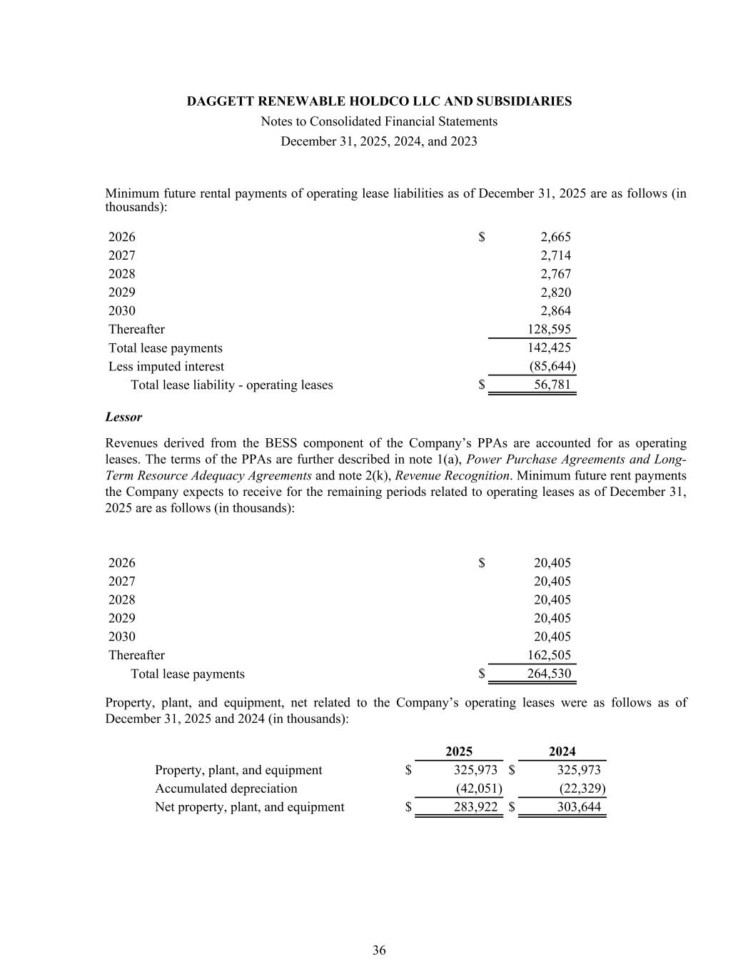 Minimum future rental payments of operating lease liabilities as of December 31, 2025 are as follows (in thousands): 2026 $ 2,665 2027 2,714 2028 2,767 2029 2,820 2030 2,864 Thereafter 128,595 Total lease payments 142,425 Less imputed interest (85,644) Total lease liability - operating leases $ 56,781 Lessor Revenues derived from the BESS component of the Company’s PPAs are accounted for as operating leases. The terms of the PPAs are further described in note 1(a), Power Purchase Agreements and Long- Term Resource Adequacy Agreements and note 2(k), Revenue Recognition. Minimum future rent payments the Company expects to receive for the remaining periods related to operating leases as of December 31, 2025 are as follows (in thousands): 2026 $ 20,405 2027 20,405 2028 20,405 2029 20,405 2030 20,405 Thereafter 162,505 Total lease payments $ 264,530 Property, plant, and equipment, net related to the Company’s operating leases were as follows as of December 31, 2025 and 2024 (in thousands): 2025 2024 Property, plant, and equipment $ 325,973 $ 325,973 Accumulated depreciation (42,051) (22,329) Net property, plant, and equipment $ 283,922 $ 303,644 DAGGETT RENEWABLE HOLDCO LLC AND SUBSIDIARIES Notes to Consolidated Financial Statements December 31, 2025, 2024, and 2023 36