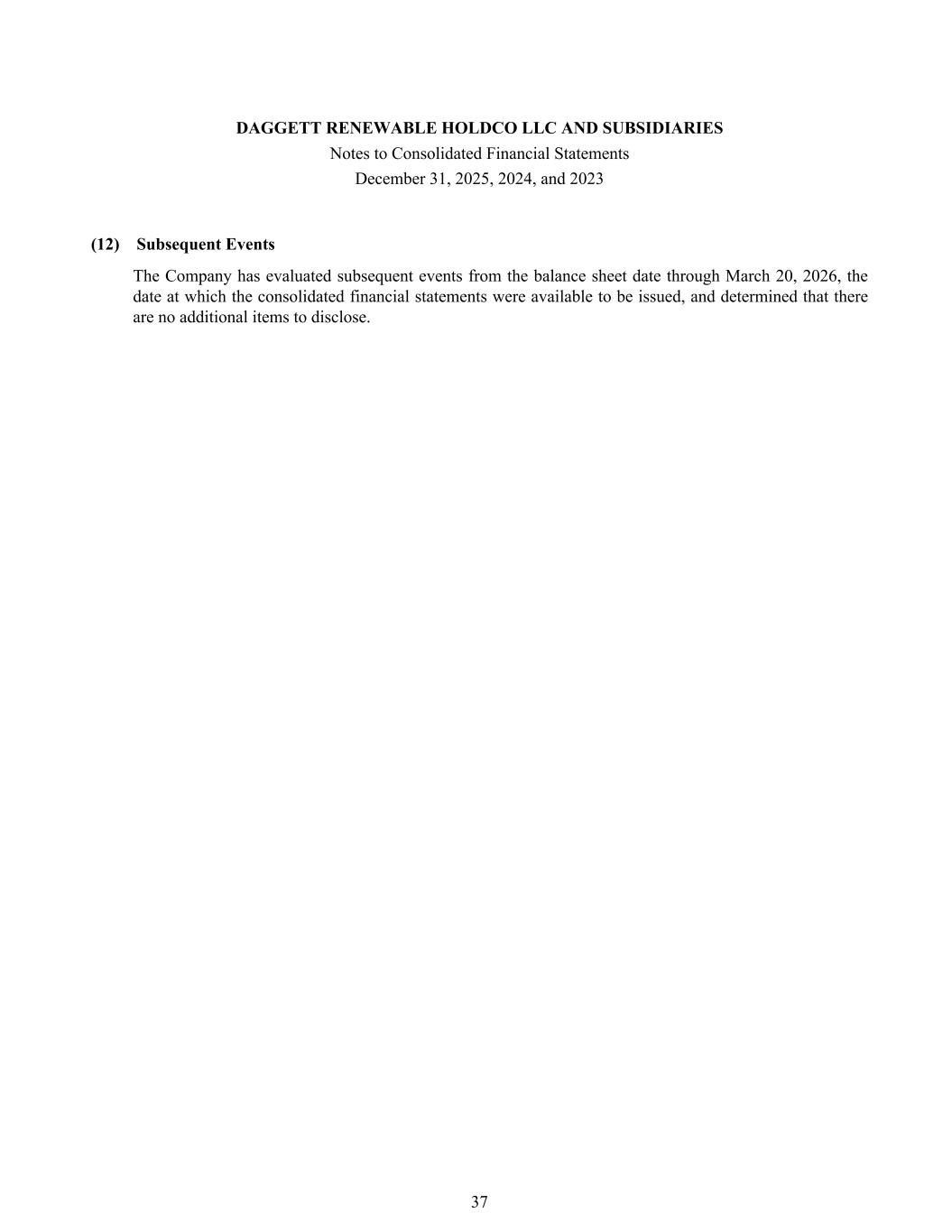 (12) Subsequent Events The Company has evaluated subsequent events from the balance sheet date through March 20, 2026, the date at which the consolidated financial statements were available to be issued, and determined that there are no additional items to disclose. DAGGETT RENEWABLE HOLDCO LLC AND SUBSIDIARIES Notes to Consolidated Financial Statements December 31, 2025, 2024, and 2023 37