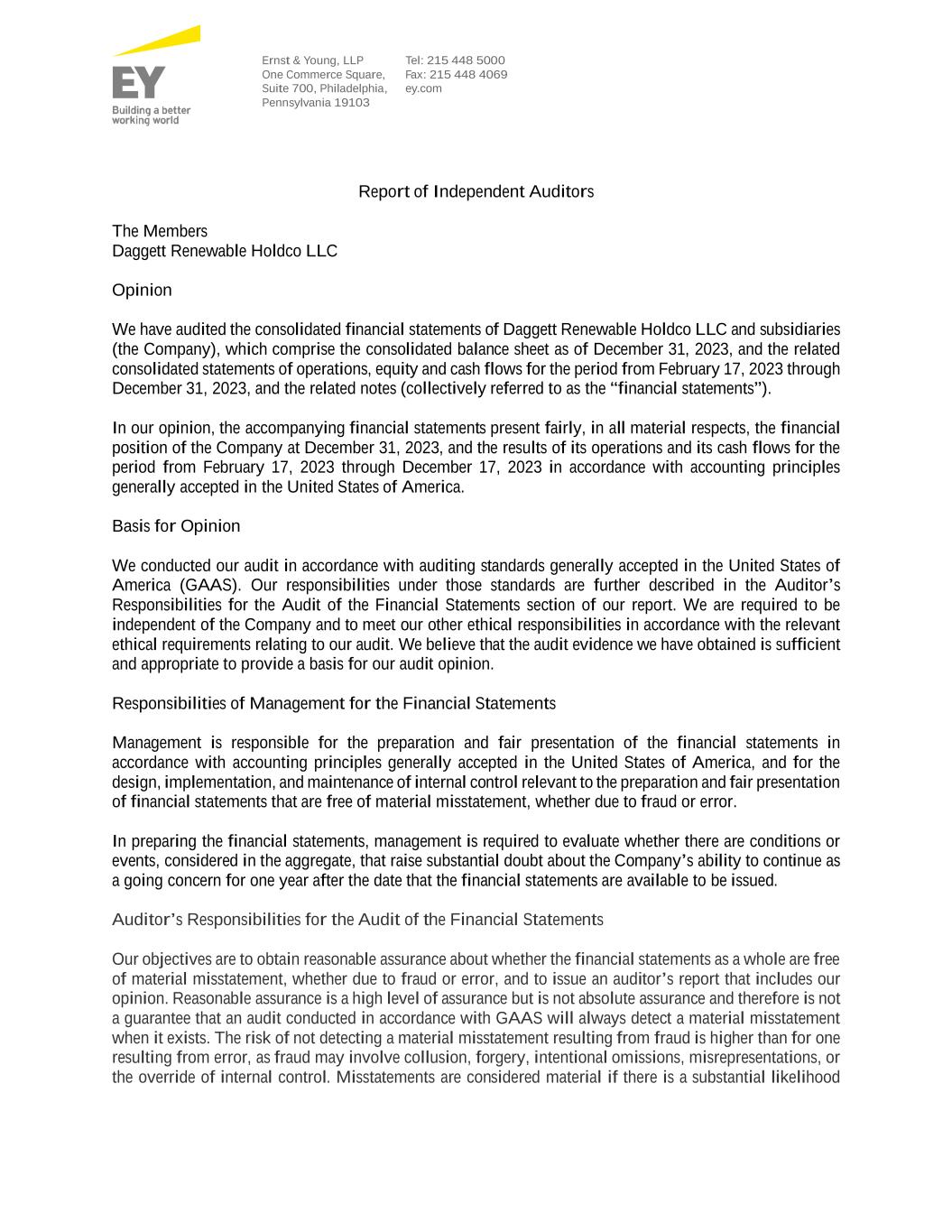 Ernst & Young, LLP One Commerce Square, Suite 700, Philadelphia, Pennsylvania 19103 Tel: 215 448 5000 Fax: 215 448 4069 ey.com Report of Independent Auditors The Members Daggett Renewable Holdco LLC Opinion We have audited the consolidated financial statements of Daggett Renewable Holdco LLC and subsidiaries (the Company), which comprise the consolidated balance sheet as of December 31, 2023, and the related consolidated statements of operations, equity and cash flows for the period from February 17, 2023 through December 31, 2023, and the related notes (collectively referred to as the “financial statements”). In our opinion, the accompanying financial statements present fairly, in all material respects, the financial position of the Company at December 31, 2023, and the results of its operations and its cash flows for the period from February 17, 2023 through December 17, 2023 in accordance with accounting principles generally accepted in the United States of America. Basis for Opinion We conducted our audit in accordance with auditing standards generally accepted in the United States of America (GAAS). Our responsibilities under those standards are further described in the Auditor’s Responsibilities for the Audit of the Financial Statements section of our report. We are required to be independent of the Company and to meet our other ethical responsibilities in accordance with the relevant ethical requirements relating to our audit. We believe that the audit evidence we have obtained is sufficient and appropriate to provide a basis for our audit opinion. Responsibilities of Management for the Financial Statements Management is responsible for the preparation and fair presentation of the financial statements in accordance with accounting principles generally accepted in the United States of America, and for the design, implementation, and maintenance of internal control relevant to the preparation and fair presentation of financial statements that are free of material misstatement, whether due to fraud or error. In preparing the financial statements, management is required to evaluate whether there are conditions or events, considered in the aggregate, that raise substantial doubt about the Company’s ability to continue as a going concern for one year after the date that the financial statements are available to be issued. Auditor’s Responsibilities for the Audit of the Financial Statements Our objectives are to obtain reasonable assurance about whether the financial statements as a whole are free of material misstatement, whether due to fraud or error, and to issue an auditor’s report that includes our opinion. Reasonable assurance is a high level of assurance but is not absolute assurance and therefore is not a guarantee that an audit conducted in accordance with GAAS will always detect a material misstatement when it exists. The risk of not detecting a material misstatement resulting from fraud is higher than for one resulting from error, as fraud may involve collusion, forgery, intentional omissions, misrepresentations, or the override of internal control. Misstatements are considered material if there is a substantial likelihood