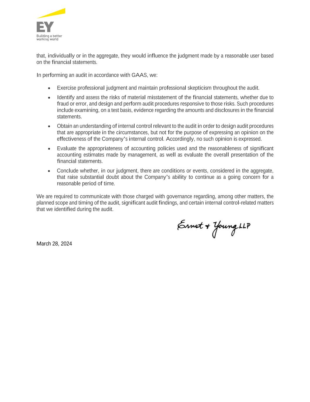 that, individually or in the aggregate, they would influence the judgment made by a reasonable user based on the financial statements. In performing an audit in accordance with GAAS, we: Exercise professional judgment and maintain professional skepticism throughout the audit. Identify and assess the risks of material misstatement of the financial statements, whether due to fraud or error, and design and perform audit procedures responsive to those risks. Such procedures include examining, on a test basis, evidence regarding the amounts and disclosures in the financial statements. Obtain an understanding of internal control relevant to the audit in order to design audit procedures that are appropriate in the circumstances, but not for the purpose of expressing an opinion on the effectiveness of the Company’s internal control. Accordingly, no such opinion is expressed. Evaluate the appropriateness of accounting policies used and the reasonableness of significant accounting estimates made by management, as well as evaluate the overall presentation of the financial statements. Conclude whether, in our judgment, there are conditions or events, considered in the aggregate, that raise substantial doubt about the Company’s ability to continue as a going concern for a reasonable period of time. We are required to communicate with those charged with governance regarding, among other matters, the planned scope and timing of the audit, significant audit findings, and certain internal control-related matters that we identified during the audit. March 28, 2024