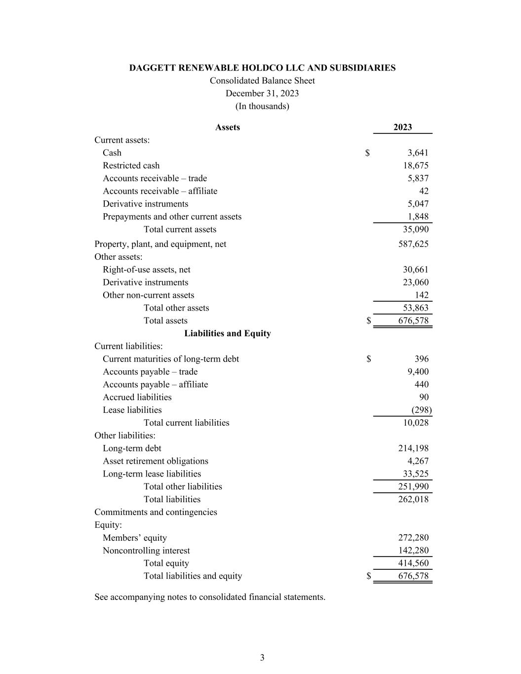 DAGGETT RENEWABLE HOLDCO LLC AND SUBSIDIARIES Consolidated Balance Sheet December 31, 2023 (In thousands) Assets 2023 Current assets: Cash $ 3,641 Restricted cash 18,675 Accounts receivable – trade 5,837 Accounts receivable – affiliate 42 Derivative instruments 5,047 Prepayments and other current assets 1,848 Total current assets 35,090 Property, plant, and equipment, net 587,625 Other assets: Right-of-use assets, net 30,661 Derivative instruments 23,060 Other non-current assets 142 Total other assets 53,863 Total assets $ 676,578 Liabilities and Equity Current liabilities: Current maturities of long-term debt $ 396 Accounts payable – trade 9,400 Accounts payable – affiliate 440 Accrued liabilities 90 Lease liabilities (298) Total current liabilities 10,028 Other liabilities: Long-term debt 214,198 Asset retirement obligations 4,267 Long-term lease liabilities 33,525 Total other liabilities 251,990 Total liabilities 262,018 Commitments and contingencies Equity: Members’ equity 272,280 Noncontrolling interest 142,280 Total equity 414,560 Total liabilities and equity $ 676,578 See accompanying notes to consolidated financial statements. 3
