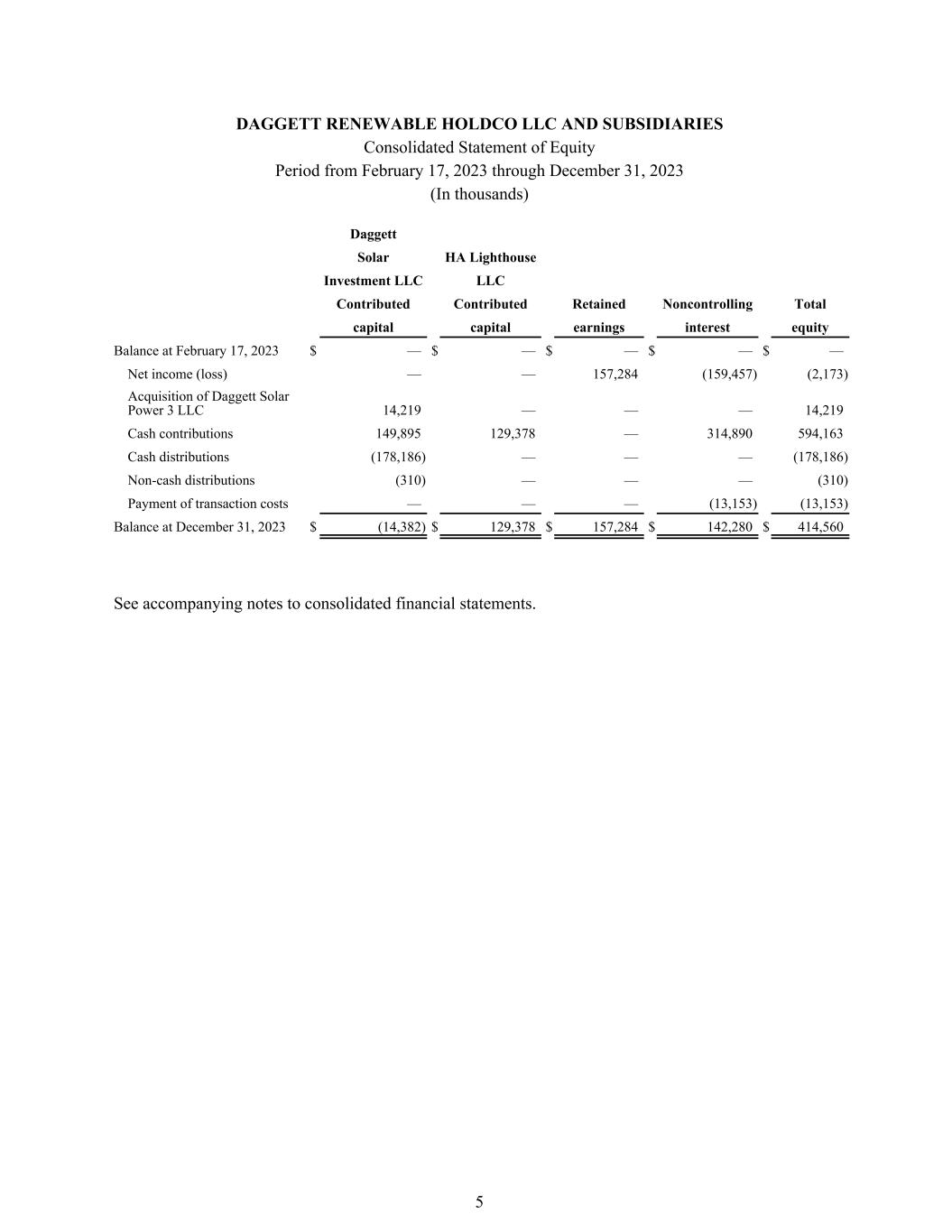 DAGGETT RENEWABLE HOLDCO LLC AND SUBSIDIARIES Consolidated Statement of Equity Period from February 17, 2023 through December 31, 2023 (In thousands) Daggett Solar HA Lighthouse Investment LLC LLC Contributed Contributed Retained Noncontrolling Total capital capital earnings interest equity Balance at February 17, 2023 $ — $ — $ — $ — $ — Net income (loss) — — 157,284 (159,457) (2,173) Acquisition of Daggett Solar Power 3 LLC 14,219 — — — 14,219 Cash contributions 149,895 129,378 — 314,890 594,163 Cash distributions (178,186) — — — (178,186) Non-cash distributions (310) — — — (310) Payment of transaction costs — — — (13,153) (13,153) Balance at December 31, 2023 $ (14,382) $ 129,378 $ 157,284 $ 142,280 $ 414,560 See accompanying notes to consolidated financial statements. 5