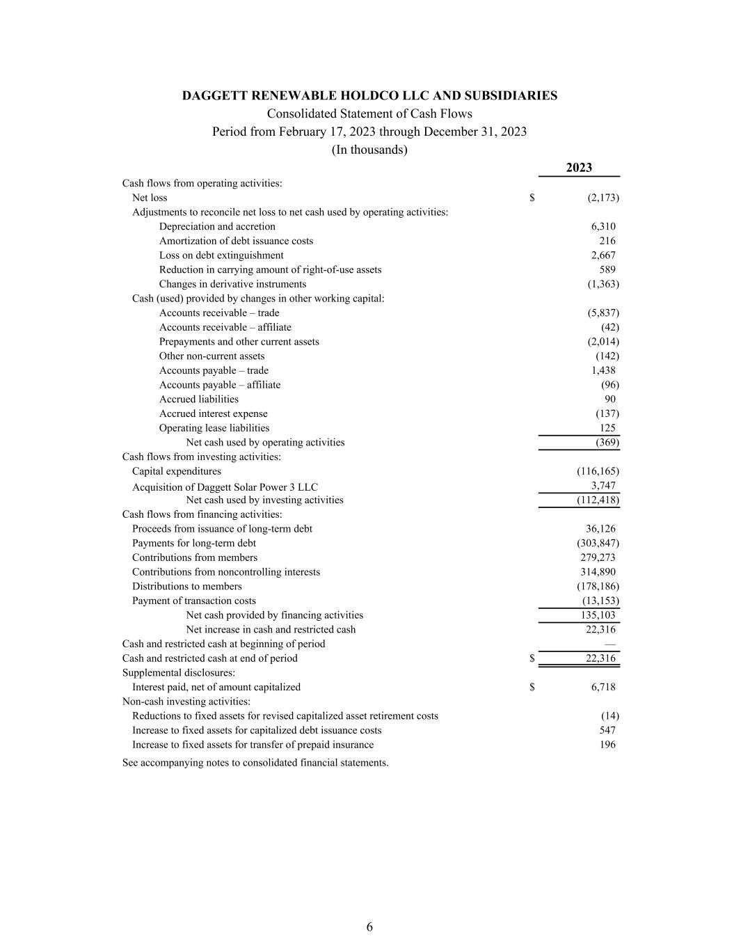 DAGGETT RENEWABLE HOLDCO LLC AND SUBSIDIARIES Consolidated Statement of Cash Flows Period from February 17, 2023 through December 31, 2023 (In thousands) 2023 Cash flows from operating activities: Net loss $ (2,173) Adjustments to reconcile net loss to net cash used by operating activities: Depreciation and accretion 6,310 Amortization of debt issuance costs 216 Loss on debt extinguishment 2,667 Reduction in carrying amount of right-of-use assets 589 Changes in derivative instruments (1,363) Cash (used) provided by changes in other working capital: Accounts receivable – trade (5,837) Accounts receivable – affiliate (42) Prepayments and other current assets (2,014) Other non-current assets (142) Accounts payable – trade 1,438 Accounts payable – affiliate (96) Accrued liabilities 90 Accrued interest expense (137) Operating lease liabilities 125 Net cash used by operating activities (369) Cash flows from investing activities: Capital expenditures (116,165) Acquisition of Daggett Solar Power 3 LLC 3,747 Net cash used by investing activities (112,418) Cash flows from financing activities: Proceeds from issuance of long-term debt 36,126 Payments for long-term debt (303,847) Contributions from members 279,273 Contributions from noncontrolling interests 314,890 Distributions to members (178,186) Payment of transaction costs (13,153) Net cash provided by financing activities 135,103 Net increase in cash and restricted cash 22,316 Cash and restricted cash at beginning of period — Cash and restricted cash at end of period $ 22,316 Supplemental disclosures: Interest paid, net of amount capitalized $ 6,718 Non-cash investing activities: Reductions to fixed assets for revised capitalized asset retirement costs (14) Increase to fixed assets for capitalized debt issuance costs 547 Increase to fixed assets for transfer of prepaid insurance 196 See accompanying notes to consolidated financial statements. 6