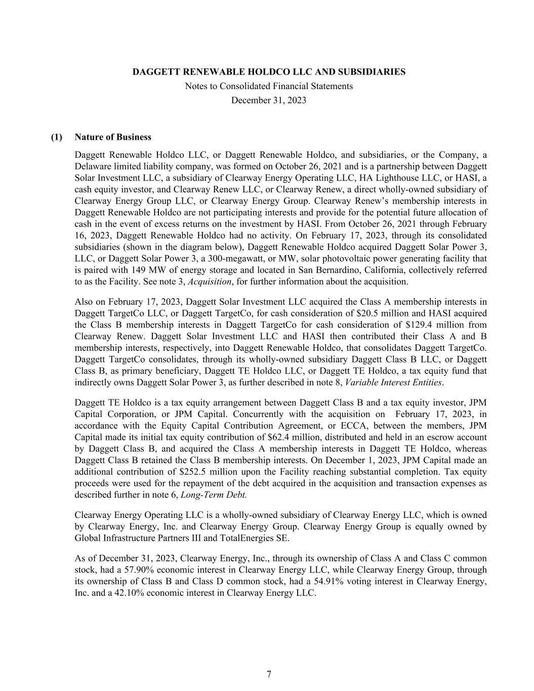 (1) Nature of Business Daggett Renewable Holdco LLC, or Daggett Renewable Holdco, and subsidiaries, or the Company, a Delaware limited liability company, was formed on October 26, 2021 and is a partnership between Daggett Solar Investment LLC, a subsidiary of Clearway Energy Operating LLC, HA Lighthouse LLC, or HASI, a cash equity investor, and Clearway Renew LLC, or Clearway Renew, a direct wholly-owned subsidiary of Clearway Energy Group LLC, or Clearway Energy Group. Clearway Renew’s membership interests in Daggett Renewable Holdco are not participating interests and provide for the potential future allocation of cash in the event of excess returns on the investment by HASI. From October 26, 2021 through February 16, 2023, Daggett Renewable Holdco had no activity. On February 17, 2023, through its consolidated subsidiaries (shown in the diagram below), Daggett Renewable Holdco acquired Daggett Solar Power 3, LLC, or Daggett Solar Power 3, a 300-megawatt, or MW, solar photovoltaic power generating facility that is paired with 149 MW of energy storage and located in San Bernardino, California, collectively referred to as the Facility. See note 3, Acquisition, for further information about the acquisition. Also on February 17, 2023, Daggett Solar Investment LLC acquired the Class A membership interests in Daggett TargetCo LLC, or Daggett TargetCo, for cash consideration of $20.5 million and HASI acquired the Class B membership interests in Daggett TargetCo for cash consideration of $129.4 million from Clearway Renew. Daggett Solar Investment LLC and HASI then contributed their Class A and B membership interests, respectively, into Daggett Renewable Holdco, that consolidates Daggett TargetCo. Daggett TargetCo consolidates, through its wholly-owned subsidiary Daggett Class B LLC, or Daggett Class B, as primary beneficiary, Daggett TE Holdco LLC, or Daggett TE Holdco, a tax equity fund that indirectly owns Daggett Solar Power 3, as further described in note 8, Variable Interest Entities. Daggett TE Holdco is a tax equity arrangement between Daggett Class B and a tax equity investor, JPM Capital Corporation, or JPM Capital. Concurrently with the acquisition on February 17, 2023, in accordance with the Equity Capital Contribution Agreement, or ECCA, between the members, JPM Capital made its initial tax equity contribution of $62.4 million, distributed and held in an escrow account by Daggett Class B, and acquired the Class A membership interests in Daggett TE Holdco, whereas Daggett Class B retained the Class B membership interests. On December 1, 2023, JPM Capital made an additional contribution of $252.5 million upon the Facility reaching substantial completion. Tax equity proceeds were used for the repayment of the debt acquired in the acquisition and transaction expenses as described further in note 6, Long-Term Debt. Clearway Energy Operating LLC is a wholly-owned subsidiary of Clearway Energy LLC, which is owned by Clearway Energy, Inc. and Clearway Energy Group. Clearway Energy Group is equally owned by Global Infrastructure Partners III and TotalEnergies SE. As of December 31, 2023, Clearway Energy, Inc., through its ownership of Class A and Class C common stock, had a 57.90% economic interest in Clearway Energy LLC, while Clearway Energy Group, through its ownership of Class B and Class D common stock, had a 54.91% voting interest in Clearway Energy, Inc. and a 42.10% economic interest in Clearway Energy LLC. DAGGETT RENEWABLE HOLDCO LLC AND SUBSIDIARIES Notes to Consolidated Financial Statements December 31, 2023 7