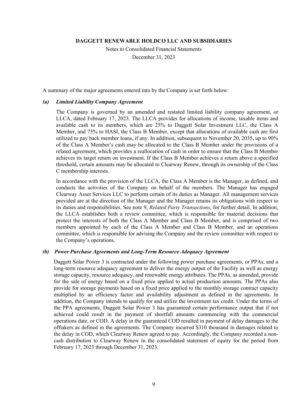 A summary of the major agreements entered into by the Company is set forth below: (a) Limited Liability Company Agreement The Company is governed by an amended and restated limited liability company agreement, or LLCA, dated February 17, 2023. The LLCA provides for allocations of income, taxable items and available cash to its members, which are 25% to Daggett Solar Investment LLC, the Class A Member, and 75% to HASI, the Class B Member, except that allocations of available cash are first utilized to pay back member loans, if any. In addition, subsequent to November 20, 2035, up to 90% of the Class A Member’s cash may be allocated to the Class B Member under the provisions of a related agreement, which provides a reallocation of cash in order to ensure that the Class B Member achieves its target return on investment. If the Class B Member achieves a return above a specified threshold, certain amounts may be allocated to Clearway Renew, through its ownership of the Class C membership interests. In accordance with the provision of the LLCA, the Class A Member is the Manager, as defined, and conducts the activities of the Company on behalf of the members. The Manager has engaged Clearway Asset Services LLC to perform certain of its duties as Manager. All management services provided are at the direction of the Manager and the Manager retains its obligations with respect to its duties and responsibilities. See note 9, Related Party Transactions, for further detail. In addition, the LLCA establishes both a review committee, which is responsible for material decisions that protect the interests of both the Class A Member and Class B Member, and is comprised of two members appointed by each of the Class A Member and Class B Member, and an operations committee, which is responsible for advising the Company and the review committee with respect to the Company’s operations. (b) Power Purchase Agreements and Long-Term Resource Adequacy Agreement Daggett Solar Power 3 is contracted under the following power purchase agreements, or PPAs, and a long-term resource adequacy agreement to deliver the energy output of the Facility as well as energy storage capacity, resource adequacy, and renewable energy attributes. The PPAs, as amended, provide for the sale of energy based on a fixed price applied to actual production amounts. The PPAs also provide for storage payments based on a fixed price applied to the monthly storage contract capacity multiplied by an efficiency factor and availability adjustment as defined in the agreements. In addition, the Company intends to qualify for and utilize the investment tax credit. Under the terms of the PPA agreements, Daggett Solar Power 3 has guaranteed certain performance output that if not achieved could result in the payment of shortfall amounts commencing with the commercial operations date, or COD. A delay in the guaranteed COD resulted in payment of delay damages to the offtakers as defined in the agreements. The Company incurred $310 thousand in damages related to the delay in COD, which Clearway Renew agreed to pay. Accordingly, the Company recorded a non- cash distribution to Clearway Renew in the consolidated statement of equity for the period from February 17, 2023 through December 31, 2023. DAGGETT RENEWABLE HOLDCO LLC AND SUBSIDIARIES Notes to Consolidated Financial Statements December 31, 2023 9