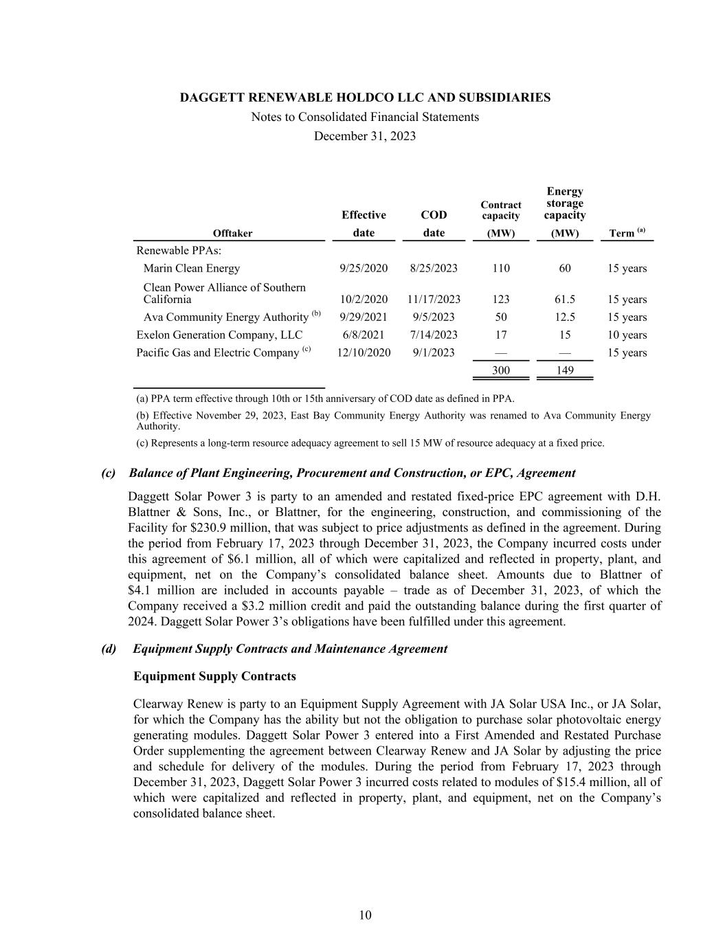 Effective COD Contract capacity Energy storage capacity Offtaker date date (MW) (MW) Term (a) Renewable PPAs: Marin Clean Energy 9/25/2020 8/25/2023 110 60 15 years Clean Power Alliance of Southern California 10/2/2020 11/17/2023 123 61.5 15 years Ava Community Energy Authority (b) 9/29/2021 9/5/2023 50 12.5 15 years Exelon Generation Company, LLC 6/8/2021 7/14/2023 17 15 10 years Pacific Gas and Electric Company (c) 12/10/2020 9/1/2023 — — 15 years 300 149 (a) PPA term effective through 10th or 15th anniversary of COD date as defined in PPA. (b) Effective November 29, 2023, East Bay Community Energy Authority was renamed to Ava Community Energy Authority. (c) Represents a long-term resource adequacy agreement to sell 15 MW of resource adequacy at a fixed price. (c) Balance of Plant Engineering, Procurement and Construction, or EPC, Agreement Daggett Solar Power 3 is party to an amended and restated fixed-price EPC agreement with D.H. Blattner & Sons, Inc., or Blattner, for the engineering, construction, and commissioning of the Facility for $230.9 million, that was subject to price adjustments as defined in the agreement. During the period from February 17, 2023 through December 31, 2023, the Company incurred costs under this agreement of $6.1 million, all of which were capitalized and reflected in property, plant, and equipment, net on the Company’s consolidated balance sheet. Amounts due to Blattner of $4.1 million are included in accounts payable – trade as of December 31, 2023, of which the Company received a $3.2 million credit and paid the outstanding balance during the first quarter of 2024. Daggett Solar Power 3’s obligations have been fulfilled under this agreement. (d) Equipment Supply Contracts and Maintenance Agreement Equipment Supply Contracts Clearway Renew is party to an Equipment Supply Agreement with JA Solar USA Inc., or JA Solar, for which the Company has the ability but not the obligation to purchase solar photovoltaic energy generating modules. Daggett Solar Power 3 entered into a First Amended and Restated Purchase Order supplementing the agreement between Clearway Renew and JA Solar by adjusting the price and schedule for delivery of the modules. During the period from February 17, 2023 through December 31, 2023, Daggett Solar Power 3 incurred costs related to modules of $15.4 million, all of which were capitalized and reflected in property, plant, and equipment, net on the Company’s consolidated balance sheet. DAGGETT RENEWABLE HOLDCO LLC AND SUBSIDIARIES Notes to Consolidated Financial Statements December 31, 2023 10
