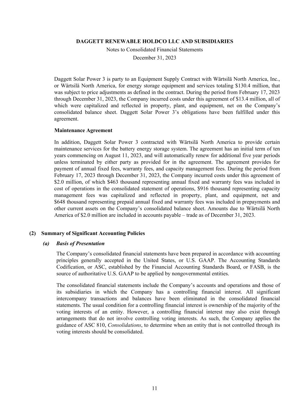 Daggett Solar Power 3 is party to an Equipment Supply Contract with Wärtsilä North America, Inc., or Wärtsilä North America, for energy storage equipment and services totaling $130.4 million, that was subject to price adjustments as defined in the contract. During the period from February 17, 2023 through December 31, 2023, the Company incurred costs under this agreement of $13.4 million, all of which were capitalized and reflected in property, plant, and equipment, net on the Company’s consolidated balance sheet. Daggett Solar Power 3’s obligations have been fulfilled under this agreement. Maintenance Agreement In addition, Daggett Solar Power 3 contracted with Wärtsilä North America to provide certain maintenance services for the battery energy storage system. The agreement has an initial term of ten years commencing on August 11, 2023, and will automatically renew for additional five year periods unless terminated by either party as provided for in the agreement. The agreement provides for payment of annual fixed fees, warranty fees, and capacity management fees. During the period from February 17, 2023 through December 31, 2023, the Company incurred costs under this agreement of $2.0 million, of which $463 thousand representing annual fixed and warranty fees was included in cost of operations in the consolidated statement of operations, $916 thousand representing capacity management fees was capitalized and reflected in property, plant, and equipment, net and $648 thousand representing prepaid annual fixed and warranty fees was included in prepayments and other current assets on the Company’s consolidated balance sheet. Amounts due to Wärtsilä North America of $2.0 million are included in accounts payable – trade as of December 31, 2023. (2) Summary of Significant Accounting Policies (a) Basis of Presentation The Company’s consolidated financial statements have been prepared in accordance with accounting principles generally accepted in the United States, or U.S. GAAP. The Accounting Standards Codification, or ASC, established by the Financial Accounting Standards Board, or FASB, is the source of authoritative U.S. GAAP to be applied by nongovernmental entities. The consolidated financial statements include the Company’s accounts and operations and those of its subsidiaries in which the Company has a controlling financial interest. All significant intercompany transactions and balances have been eliminated in the consolidated financial statements. The usual condition for a controlling financial interest is ownership of the majority of the voting interests of an entity. However, a controlling financial interest may also exist through arrangements that do not involve controlling voting interests. As such, the Company applies the guidance of ASC 810, Consolidations, to determine when an entity that is not controlled through its voting interests should be consolidated. DAGGETT RENEWABLE HOLDCO LLC AND SUBSIDIARIES Notes to Consolidated Financial Statements December 31, 2023 11