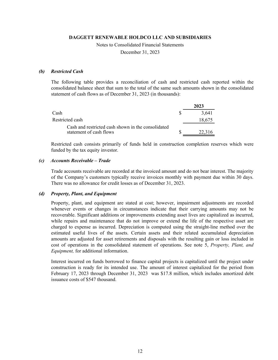 (b) Restricted Cash The following table provides a reconciliation of cash and restricted cash reported within the consolidated balance sheet that sum to the total of the same such amounts shown in the consolidated statement of cash flows as of December 31, 2023 (in thousands): 2023 Cash $ 3,641 Restricted cash 18,675 Cash and restricted cash shown in the consolidated statement of cash flows $ 22,316 Restricted cash consists primarily of funds held in construction completion reserves which were funded by the tax equity investor. (c) Accounts Receivable – Trade Trade accounts receivable are recorded at the invoiced amount and do not bear interest. The majority of the Company’s customers typically receive invoices monthly with payment due within 30 days. There was no allowance for credit losses as of December 31, 2023. (d) Property, Plant, and Equipment Property, plant, and equipment are stated at cost; however, impairment adjustments are recorded whenever events or changes in circumstances indicate that their carrying amounts may not be recoverable. Significant additions or improvements extending asset lives are capitalized as incurred, while repairs and maintenance that do not improve or extend the life of the respective asset are charged to expense as incurred. Depreciation is computed using the straight-line method over the estimated useful lives of the assets. Certain assets and their related accumulated depreciation amounts are adjusted for asset retirements and disposals with the resulting gain or loss included in cost of operations in the consolidated statement of operations. See note 5, Property, Plant, and Equipment, for additional information. Interest incurred on funds borrowed to finance capital projects is capitalized until the project under construction is ready for its intended use. The amount of interest capitalized for the period from February 17, 2023 through December 31, 2023 was $17.8 million, which includes amortized debt issuance costs of $547 thousand. DAGGETT RENEWABLE HOLDCO LLC AND SUBSIDIARIES Notes to Consolidated Financial Statements December 31, 2023 12