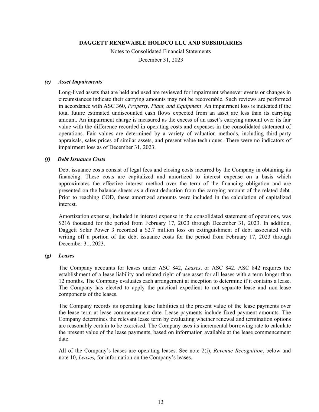 (e) Asset Impairments Long-lived assets that are held and used are reviewed for impairment whenever events or changes in circumstances indicate their carrying amounts may not be recoverable. Such reviews are performed in accordance with ASC 360, Property, Plant, and Equipment. An impairment loss is indicated if the total future estimated undiscounted cash flows expected from an asset are less than its carrying amount. An impairment charge is measured as the excess of an asset’s carrying amount over its fair value with the difference recorded in operating costs and expenses in the consolidated statement of operations. Fair values are determined by a variety of valuation methods, including third-party appraisals, sales prices of similar assets, and present value techniques. There were no indicators of impairment loss as of December 31, 2023. (f) Debt Issuance Costs Debt issuance costs consist of legal fees and closing costs incurred by the Company in obtaining its financing. These costs are capitalized and amortized to interest expense on a basis which approximates the effective interest method over the term of the financing obligation and are presented on the balance sheets as a direct deduction from the carrying amount of the related debt. Prior to reaching COD, these amortized amounts were included in the calculation of capitalized interest. Amortization expense, included in interest expense in the consolidated statement of operations, was $216 thousand for the period from February 17, 2023 through December 31, 2023. In addition, Daggett Solar Power 3 recorded a $2.7 million loss on extinguishment of debt associated with writing off a portion of the debt issuance costs for the period from February 17, 2023 through December 31, 2023. (g) Leases The Company accounts for leases under ASC 842, Leases, or ASC 842. ASC 842 requires the establishment of a lease liability and related right-of-use asset for all leases with a term longer than 12 months. The Company evaluates each arrangement at inception to determine if it contains a lease. The Company has elected to apply the practical expedient to not separate lease and non-lease components of the leases. The Company records its operating lease liabilities at the present value of the lease payments over the lease term at lease commencement date. Lease payments include fixed payment amounts. The Company determines the relevant lease term by evaluating whether renewal and termination options are reasonably certain to be exercised. The Company uses its incremental borrowing rate to calculate the present value of the lease payments, based on information available at the lease commencement date. All of the Company’s leases are operating leases. See note 2(i), Revenue Recognition, below and note 10, Leases, for information on the Company’s leases. DAGGETT RENEWABLE HOLDCO LLC AND SUBSIDIARIES Notes to Consolidated Financial Statements December 31, 2023 13