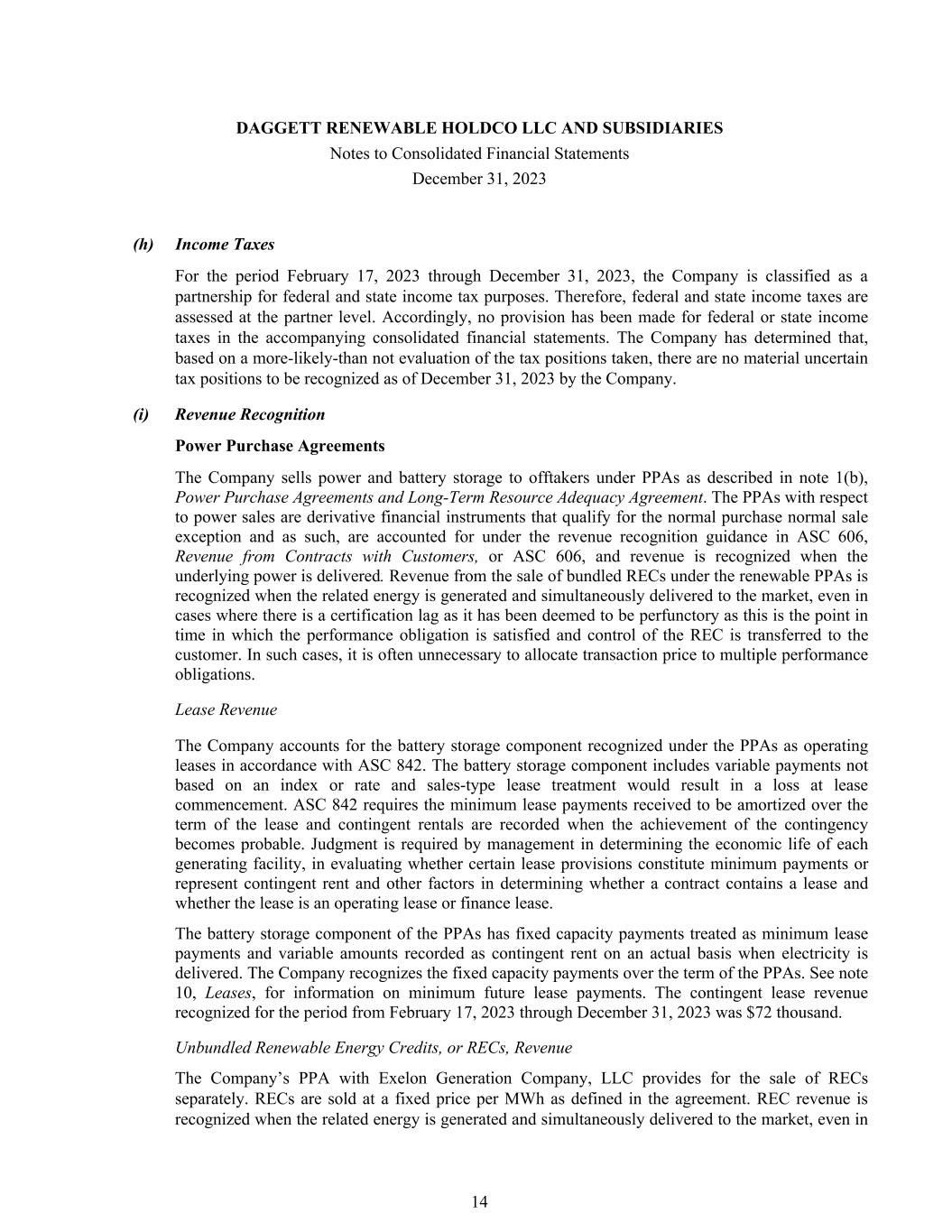 (h) Income Taxes For the period February 17, 2023 through December 31, 2023, the Company is classified as a partnership for federal and state income tax purposes. Therefore, federal and state income taxes are assessed at the partner level. Accordingly, no provision has been made for federal or state income taxes in the accompanying consolidated financial statements. The Company has determined that, based on a more-likely-than not evaluation of the tax positions taken, there are no material uncertain tax positions to be recognized as of December 31, 2023 by the Company. (i) Revenue Recognition Power Purchase Agreements The Company sells power and battery storage to offtakers under PPAs as described in note 1(b), Power Purchase Agreements and Long-Term Resource Adequacy Agreement. The PPAs with respect to power sales are derivative financial instruments that qualify for the normal purchase normal sale exception and as such, are accounted for under the revenue recognition guidance in ASC 606, Revenue from Contracts with Customers, or ASC 606, and revenue is recognized when the underlying power is delivered. Revenue from the sale of bundled RECs under the renewable PPAs is recognized when the related energy is generated and simultaneously delivered to the market, even in cases where there is a certification lag as it has been deemed to be perfunctory as this is the point in time in which the performance obligation is satisfied and control of the REC is transferred to the customer. In such cases, it is often unnecessary to allocate transaction price to multiple performance obligations. Lease Revenue The Company accounts for the battery storage component recognized under the PPAs as operating leases in accordance with ASC 842. The battery storage component includes variable payments not based on an index or rate and sales-type lease treatment would result in a loss at lease commencement. ASC 842 requires the minimum lease payments received to be amortized over the term of the lease and contingent rentals are recorded when the achievement of the contingency becomes probable. Judgment is required by management in determining the economic life of each generating facility, in evaluating whether certain lease provisions constitute minimum payments or represent contingent rent and other factors in determining whether a contract contains a lease and whether the lease is an operating lease or finance lease. The battery storage component of the PPAs has fixed capacity payments treated as minimum lease payments and variable amounts recorded as contingent rent on an actual basis when electricity is delivered. The Company recognizes the fixed capacity payments over the term of the PPAs. See note 10, Leases, for information on minimum future lease payments. The contingent lease revenue recognized for the period from February 17, 2023 through December 31, 2023 was $72 thousand. Unbundled Renewable Energy Credits, or RECs, Revenue The Company’s PPA with Exelon Generation Company, LLC provides for the sale of RECs separately. RECs are sold at a fixed price per MWh as defined in the agreement. REC revenue is recognized when the related energy is generated and simultaneously delivered to the market, even in DAGGETT RENEWABLE HOLDCO LLC AND SUBSIDIARIES Notes to Consolidated Financial Statements December 31, 2023 14