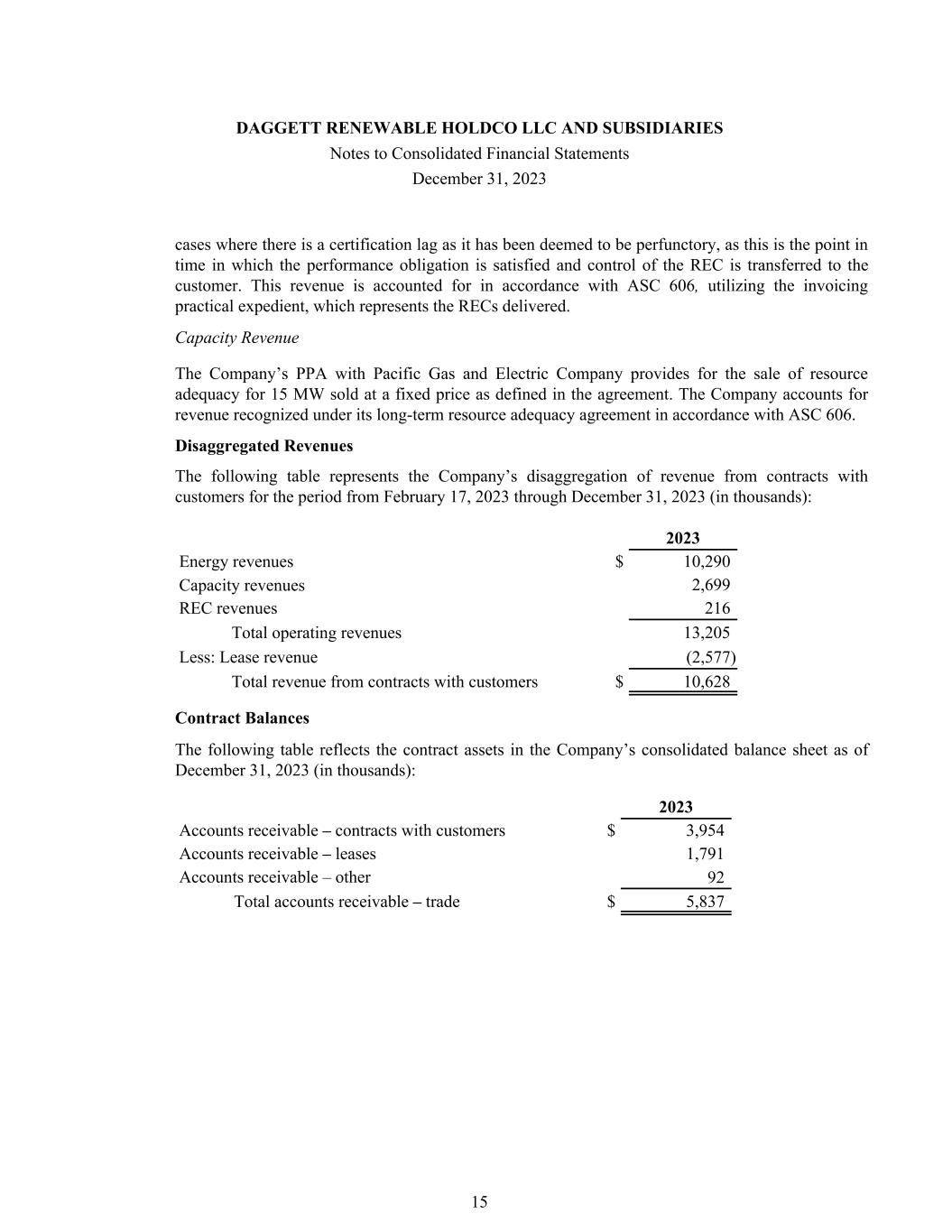 cases where there is a certification lag as it has been deemed to be perfunctory, as this is the point in time in which the performance obligation is satisfied and control of the REC is transferred to the customer. This revenue is accounted for in accordance with ASC 606, utilizing the invoicing practical expedient, which represents the RECs delivered. Capacity Revenue The Company’s PPA with Pacific Gas and Electric Company provides for the sale of resource adequacy for 15 MW sold at a fixed price as defined in the agreement. The Company accounts for revenue recognized under its long-term resource adequacy agreement in accordance with ASC 606. Disaggregated Revenues The following table represents the Company’s disaggregation of revenue from contracts with customers for the period from February 17, 2023 through December 31, 2023 (in thousands): 2023 Energy revenues $ 10,290 Capacity revenues 2,699 REC revenues 216 Total operating revenues 13,205 Less: Lease revenue (2,577) Total revenue from contracts with customers $ 10,628 Contract Balances The following table reflects the contract assets in the Company’s consolidated balance sheet as of December 31, 2023 (in thousands): 2023 Accounts receivable – contracts with customers $ 3,954 Accounts receivable – leases 1,791 Accounts receivable – other 92 Total accounts receivable – trade $ 5,837 DAGGETT RENEWABLE HOLDCO LLC AND SUBSIDIARIES Notes to Consolidated Financial Statements December 31, 2023 15