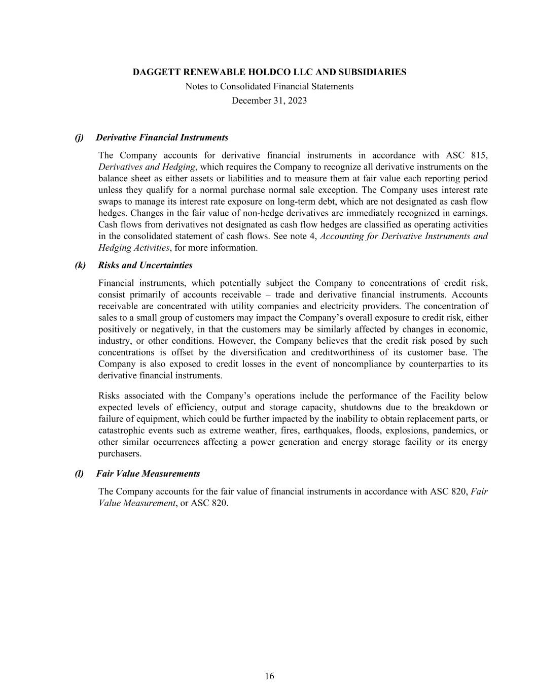 (j) Derivative Financial Instruments The Company accounts for derivative financial instruments in accordance with ASC 815, Derivatives and Hedging, which requires the Company to recognize all derivative instruments on the balance sheet as either assets or liabilities and to measure them at fair value each reporting period unless they qualify for a normal purchase normal sale exception. The Company uses interest rate swaps to manage its interest rate exposure on long-term debt, which are not designated as cash flow hedges. Changes in the fair value of non-hedge derivatives are immediately recognized in earnings. Cash flows from derivatives not designated as cash flow hedges are classified as operating activities in the consolidated statement of cash flows. See note 4, Accounting for Derivative Instruments and Hedging Activities, for more information. (k) Risks and Uncertainties Financial instruments, which potentially subject the Company to concentrations of credit risk, consist primarily of accounts receivable – trade and derivative financial instruments. Accounts receivable are concentrated with utility companies and electricity providers. The concentration of sales to a small group of customers may impact the Company’s overall exposure to credit risk, either positively or negatively, in that the customers may be similarly affected by changes in economic, industry, or other conditions. However, the Company believes that the credit risk posed by such concentrations is offset by the diversification and creditworthiness of its customer base. The Company is also exposed to credit losses in the event of noncompliance by counterparties to its derivative financial instruments. Risks associated with the Company’s operations include the performance of the Facility below expected levels of efficiency, output and storage capacity, shutdowns due to the breakdown or failure of equipment, which could be further impacted by the inability to obtain replacement parts, or catastrophic events such as extreme weather, fires, earthquakes, floods, explosions, pandemics, or other similar occurrences affecting a power generation and energy storage facility or its energy purchasers. (l) Fair Value Measurements The Company accounts for the fair value of financial instruments in accordance with ASC 820, Fair Value Measurement, or ASC 820. DAGGETT RENEWABLE HOLDCO LLC AND SUBSIDIARIES Notes to Consolidated Financial Statements December 31, 2023 16