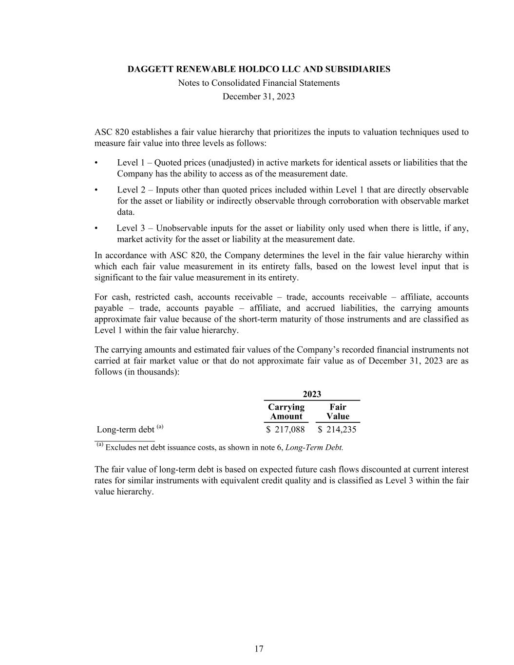 ASC 820 establishes a fair value hierarchy that prioritizes the inputs to valuation techniques used to measure fair value into three levels as follows: • Level 1 – Quoted prices (unadjusted) in active markets for identical assets or liabilities that the Company has the ability to access as of the measurement date. • Level 2 – Inputs other than quoted prices included within Level 1 that are directly observable for the asset or liability or indirectly observable through corroboration with observable market data. • Level 3 – Unobservable inputs for the asset or liability only used when there is little, if any, market activity for the asset or liability at the measurement date. In accordance with ASC 820, the Company determines the level in the fair value hierarchy within which each fair value measurement in its entirety falls, based on the lowest level input that is significant to the fair value measurement in its entirety. For cash, restricted cash, accounts receivable – trade, accounts receivable – affiliate, accounts payable – trade, accounts payable – affiliate, and accrued liabilities, the carrying amounts approximate fair value because of the short-term maturity of those instruments and are classified as Level 1 within the fair value hierarchy. The carrying amounts and estimated fair values of the Company’s recorded financial instruments not carried at fair market value or that do not approximate fair value as of December 31, 2023 are as follows (in thousands): 2023 Carrying Amount Fair Value Long-term debt (a) $ 217,088 $ 214,235 (a) Excludes net debt issuance costs, as shown in note 6, Long-Term Debt. The fair value of long-term debt is based on expected future cash flows discounted at current interest rates for similar instruments with equivalent credit quality and is classified as Level 3 within the fair value hierarchy. DAGGETT RENEWABLE HOLDCO LLC AND SUBSIDIARIES Notes to Consolidated Financial Statements December 31, 2023 17