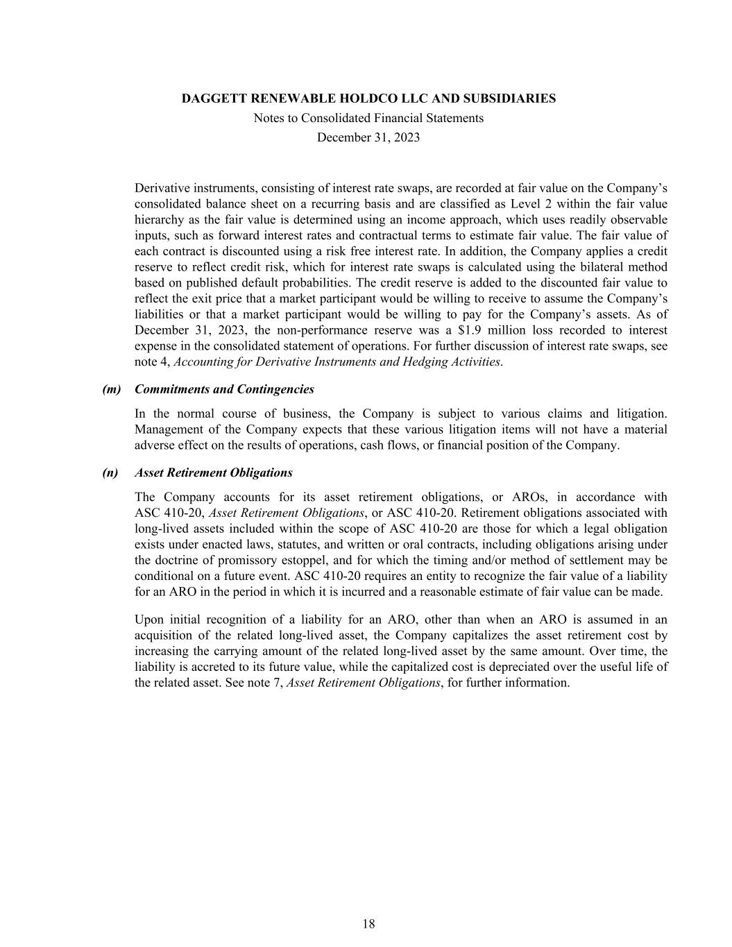 Derivative instruments, consisting of interest rate swaps, are recorded at fair value on the Company’s consolidated balance sheet on a recurring basis and are classified as Level 2 within the fair value hierarchy as the fair value is determined using an income approach, which uses readily observable inputs, such as forward interest rates and contractual terms to estimate fair value. The fair value of each contract is discounted using a risk free interest rate. In addition, the Company applies a credit reserve to reflect credit risk, which for interest rate swaps is calculated using the bilateral method based on published default probabilities. The credit reserve is added to the discounted fair value to reflect the exit price that a market participant would be willing to receive to assume the Company’s liabilities or that a market participant would be willing to pay for the Company’s assets. As of December 31, 2023, the non-performance reserve was a $1.9 million loss recorded to interest expense in the consolidated statement of operations. For further discussion of interest rate swaps, see note 4, Accounting for Derivative Instruments and Hedging Activities. (m) Commitments and Contingencies In the normal course of business, the Company is subject to various claims and litigation. Management of the Company expects that these various litigation items will not have a material adverse effect on the results of operations, cash flows, or financial position of the Company. (n) Asset Retirement Obligations The Company accounts for its asset retirement obligations, or AROs, in accordance with ASC 410-20, Asset Retirement Obligations, or ASC 410-20. Retirement obligations associated with long-lived assets included within the scope of ASC 410-20 are those for which a legal obligation exists under enacted laws, statutes, and written or oral contracts, including obligations arising under the doctrine of promissory estoppel, and for which the timing and/or method of settlement may be conditional on a future event. ASC 410-20 requires an entity to recognize the fair value of a liability for an ARO in the period in which it is incurred and a reasonable estimate of fair value can be made. Upon initial recognition of a liability for an ARO, other than when an ARO is assumed in an acquisition of the related long-lived asset, the Company capitalizes the asset retirement cost by increasing the carrying amount of the related long-lived asset by the same amount. Over time, the liability is accreted to its future value, while the capitalized cost is depreciated over the useful life of the related asset. See note 7, Asset Retirement Obligations, for further information. DAGGETT RENEWABLE HOLDCO LLC AND SUBSIDIARIES Notes to Consolidated Financial Statements December 31, 2023 18
