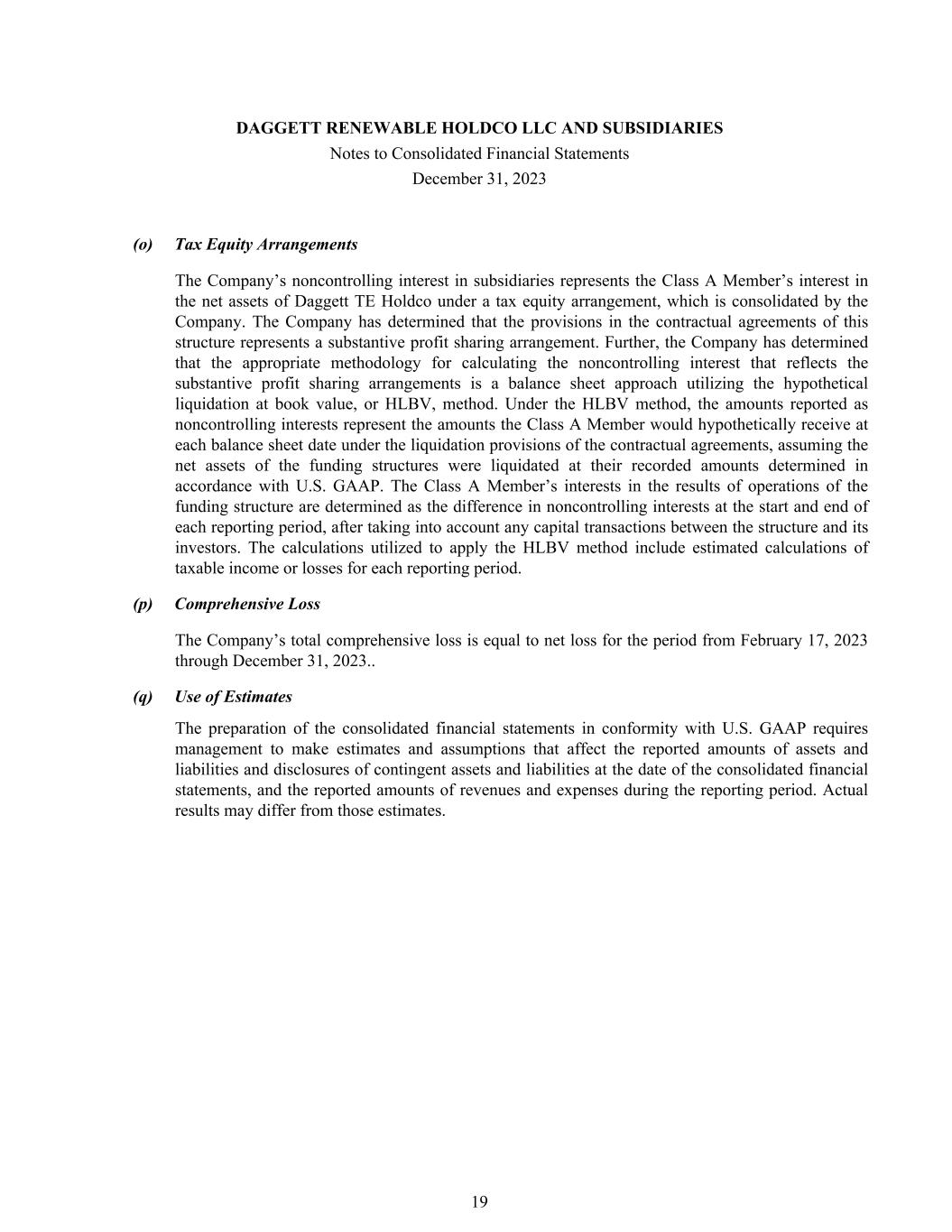 (o) Tax Equity Arrangements The Company’s noncontrolling interest in subsidiaries represents the Class A Member’s interest in the net assets of Daggett TE Holdco under a tax equity arrangement, which is consolidated by the Company. The Company has determined that the provisions in the contractual agreements of this structure represents a substantive profit sharing arrangement. Further, the Company has determined that the appropriate methodology for calculating the noncontrolling interest that reflects the substantive profit sharing arrangements is a balance sheet approach utilizing the hypothetical liquidation at book value, or HLBV, method. Under the HLBV method, the amounts reported as noncontrolling interests represent the amounts the Class A Member would hypothetically receive at each balance sheet date under the liquidation provisions of the contractual agreements, assuming the net assets of the funding structures were liquidated at their recorded amounts determined in accordance with U.S. GAAP. The Class A Member’s interests in the results of operations of the funding structure are determined as the difference in noncontrolling interests at the start and end of each reporting period, after taking into account any capital transactions between the structure and its investors. The calculations utilized to apply the HLBV method include estimated calculations of taxable income or losses for each reporting period. (p) Comprehensive Loss The Company’s total comprehensive loss is equal to net loss for the period from February 17, 2023 through December 31, 2023.. (q) Use of Estimates The preparation of the consolidated financial statements in conformity with U.S. GAAP requires management to make estimates and assumptions that affect the reported amounts of assets and liabilities and disclosures of contingent assets and liabilities at the date of the consolidated financial statements, and the reported amounts of revenues and expenses during the reporting period. Actual results may differ from those estimates. DAGGETT RENEWABLE HOLDCO LLC AND SUBSIDIARIES Notes to Consolidated Financial Statements December 31, 2023 19